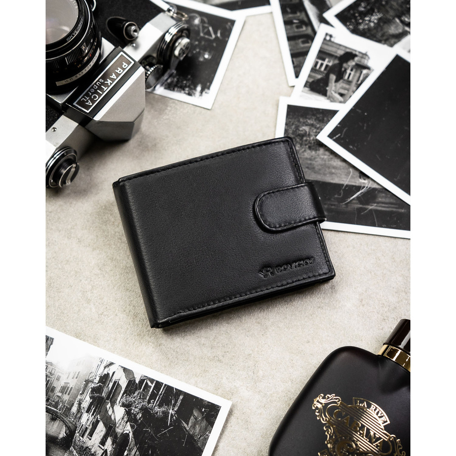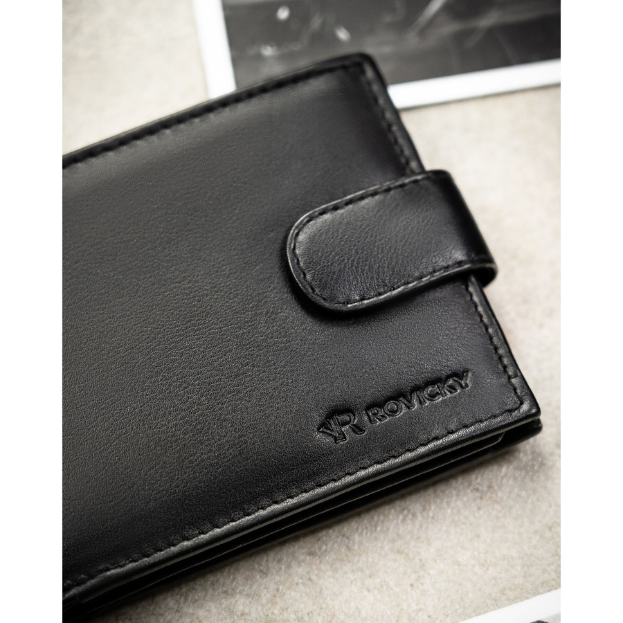 Duży, czarny portfel męski ze skóry naturalnej wyposażony w system RFID, zamykany na zatrzask - Rovicky