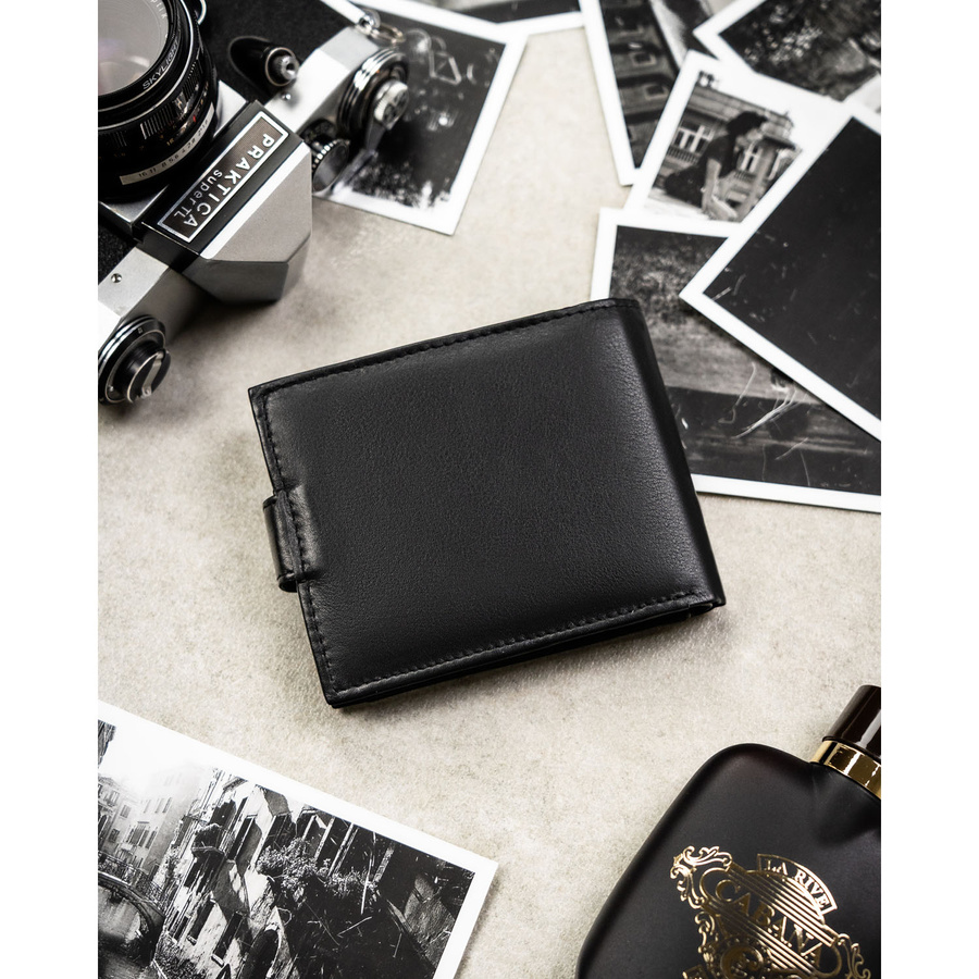 • Portfel męski wykonany ze skóry naturalnej w czarnym kolorze. Model w orientacji poziomej zapinany bezpiecznym zatrzaskiem. Wyposażony w system RFID. Ma 6 miejsc na karty i mieści dowód rejestracyjny.