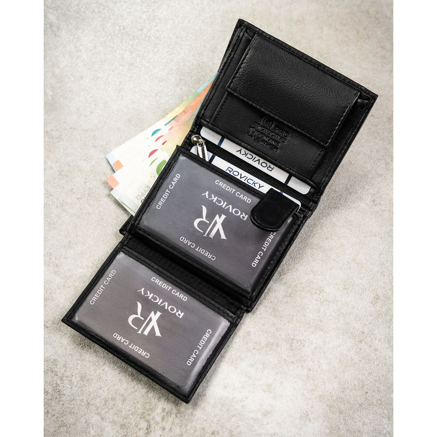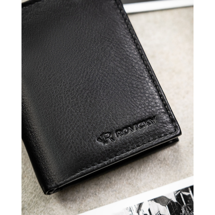 Cienki, pionowy portfel męski ze skóry naturalnej w czarnym kolorze - Rovicky