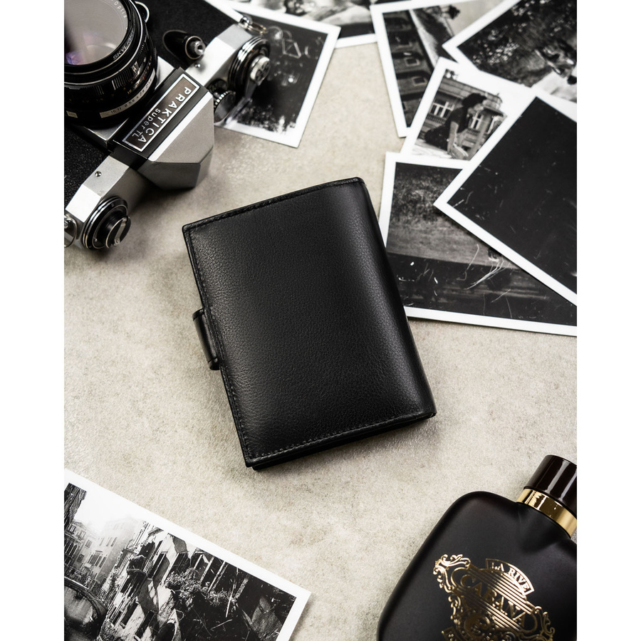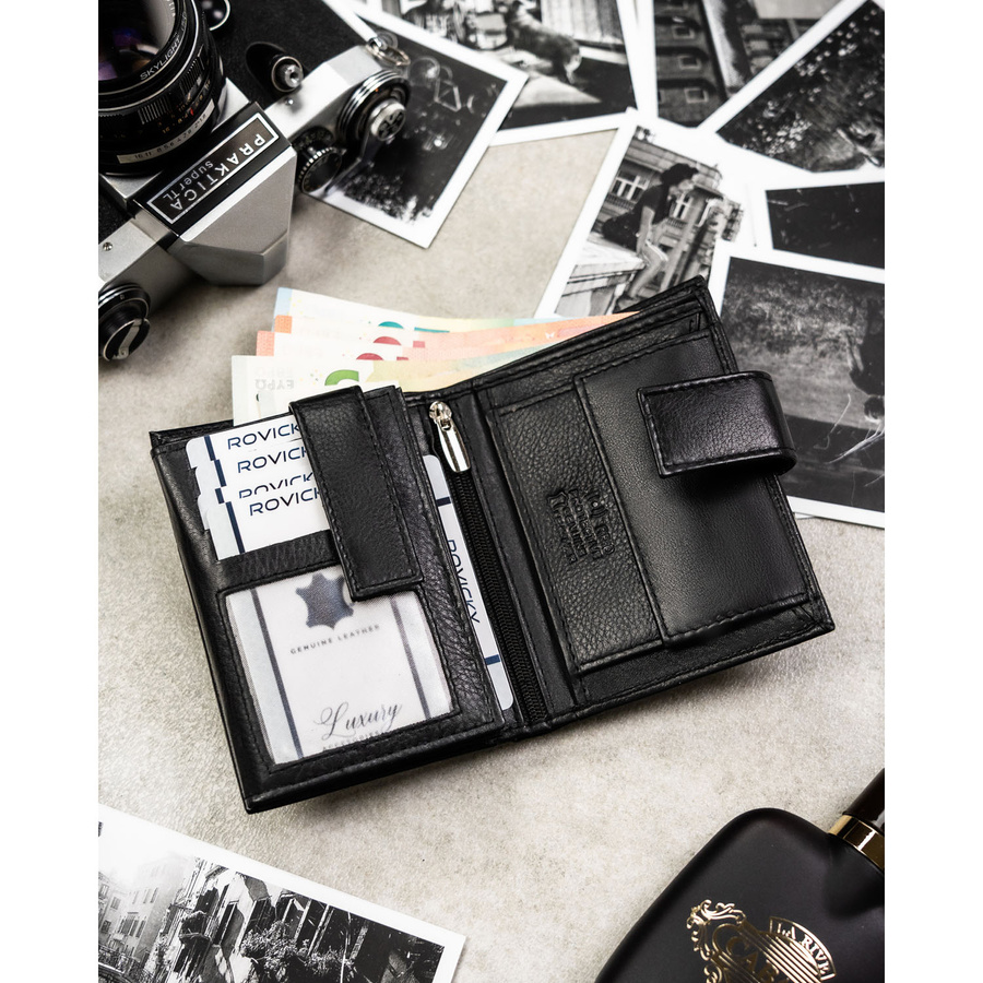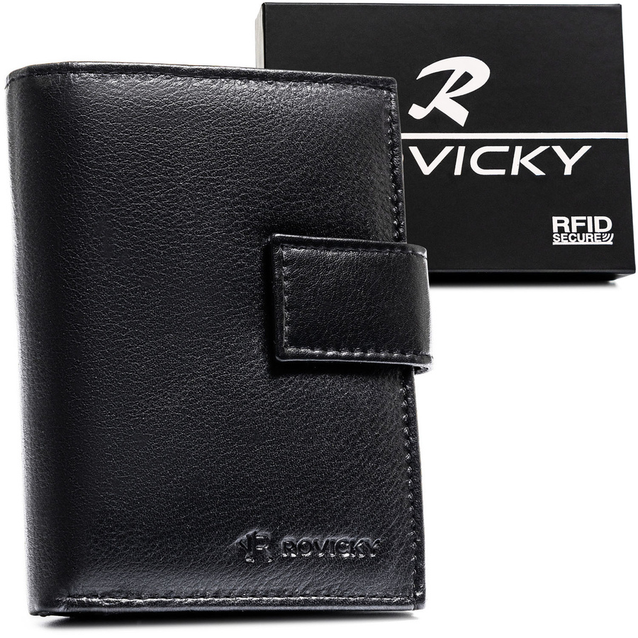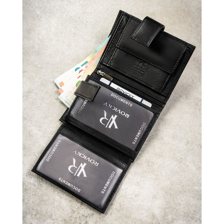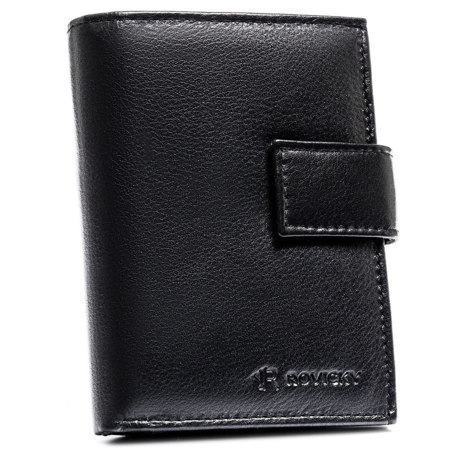 Duży portfel męski ze skóry naturalnej w czarnym kolorze, mieszczący dowód rejestracyjny i zamykany na zatrzask - Rovicky
