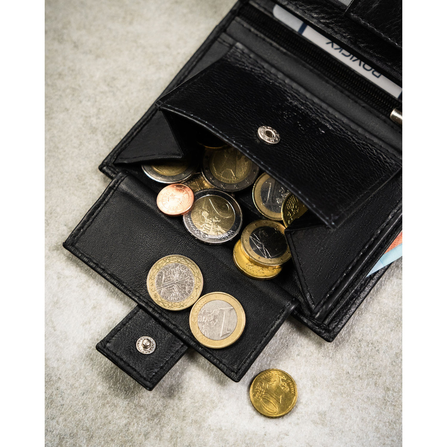 - 1 duża kieszeń na bilon zapinana na zatrzask – solidna, głęboka i wygodna.