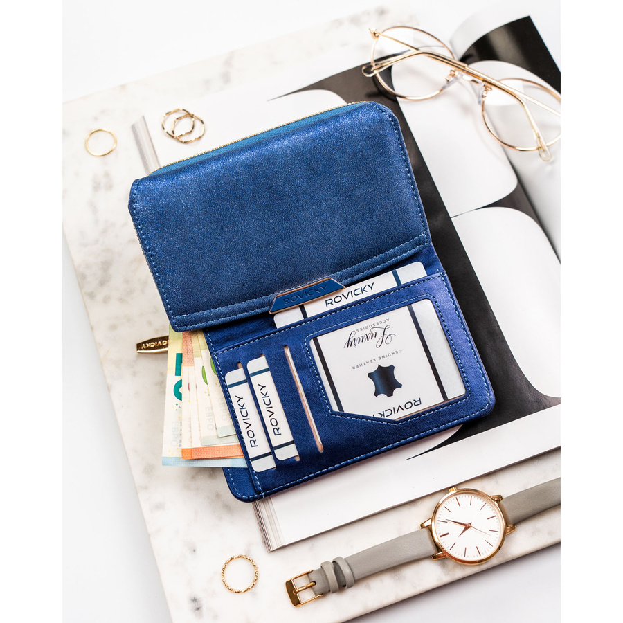 Średni portfel damski ze skóry ekologicznej w granatowym kolorze - Rovicky
