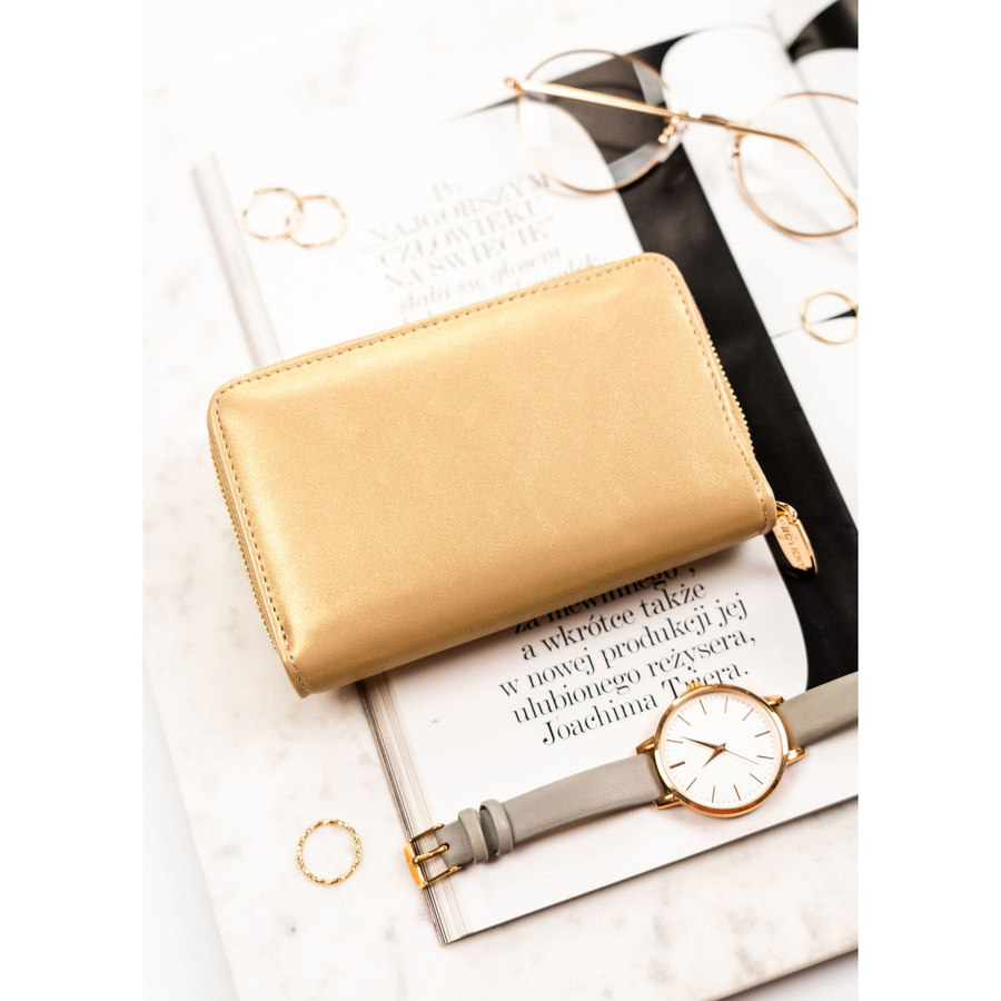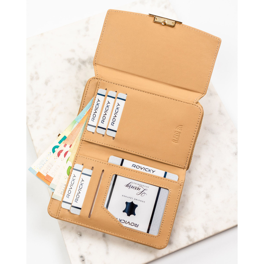 Średni, ciemnobeżowy portfel damski ze skóry ekologicznej, model mieszczący dowód rejestracyjny - Rovicky