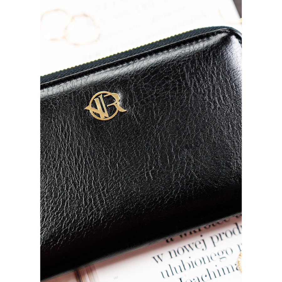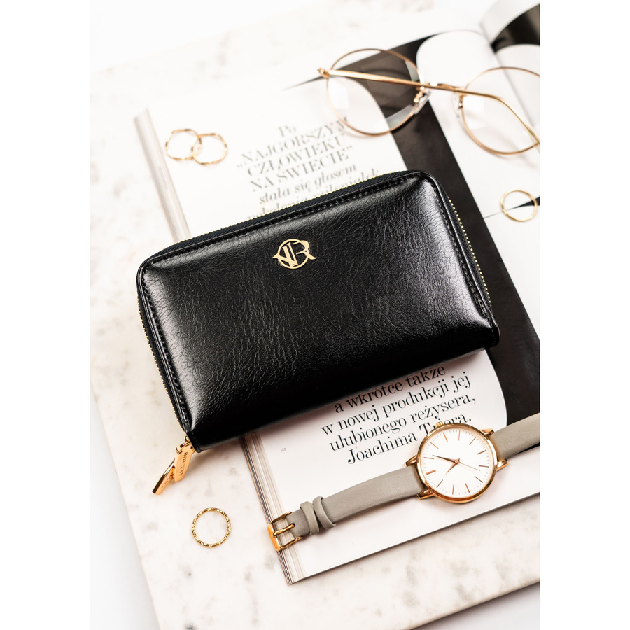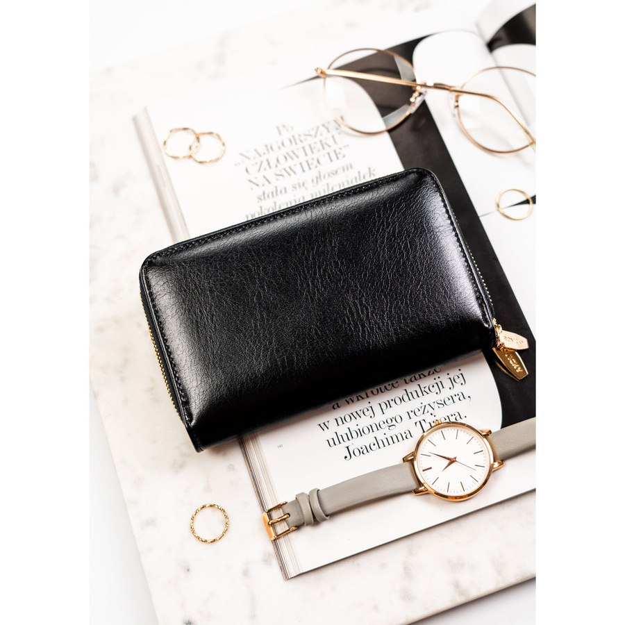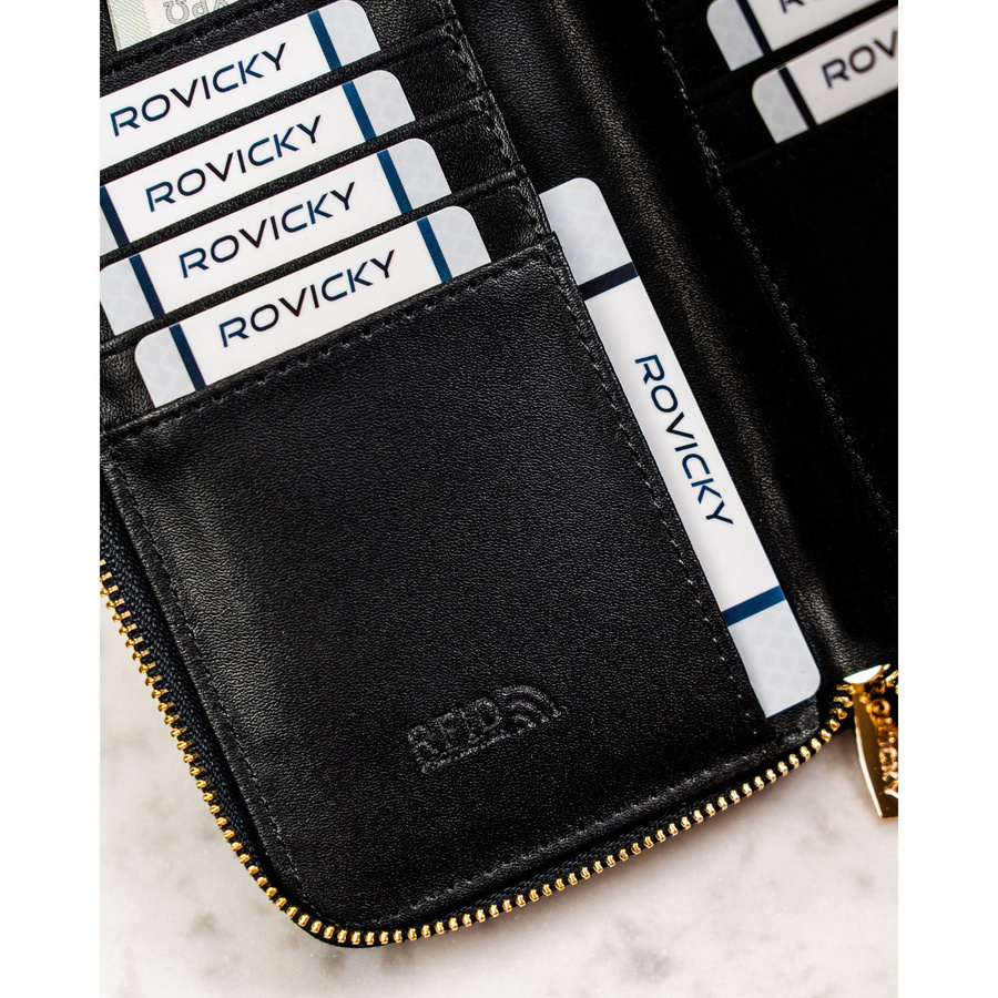 Duży, czarny portfel damski ze skóry ekologicznej zamykany suwakiem - Rovicky