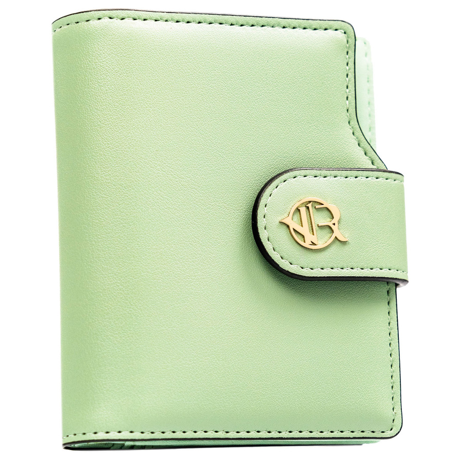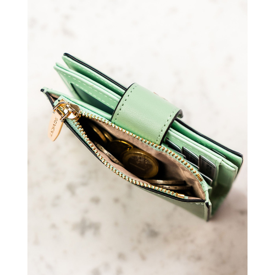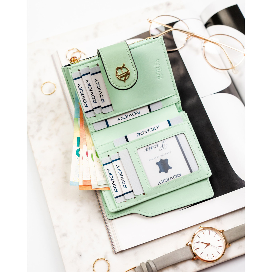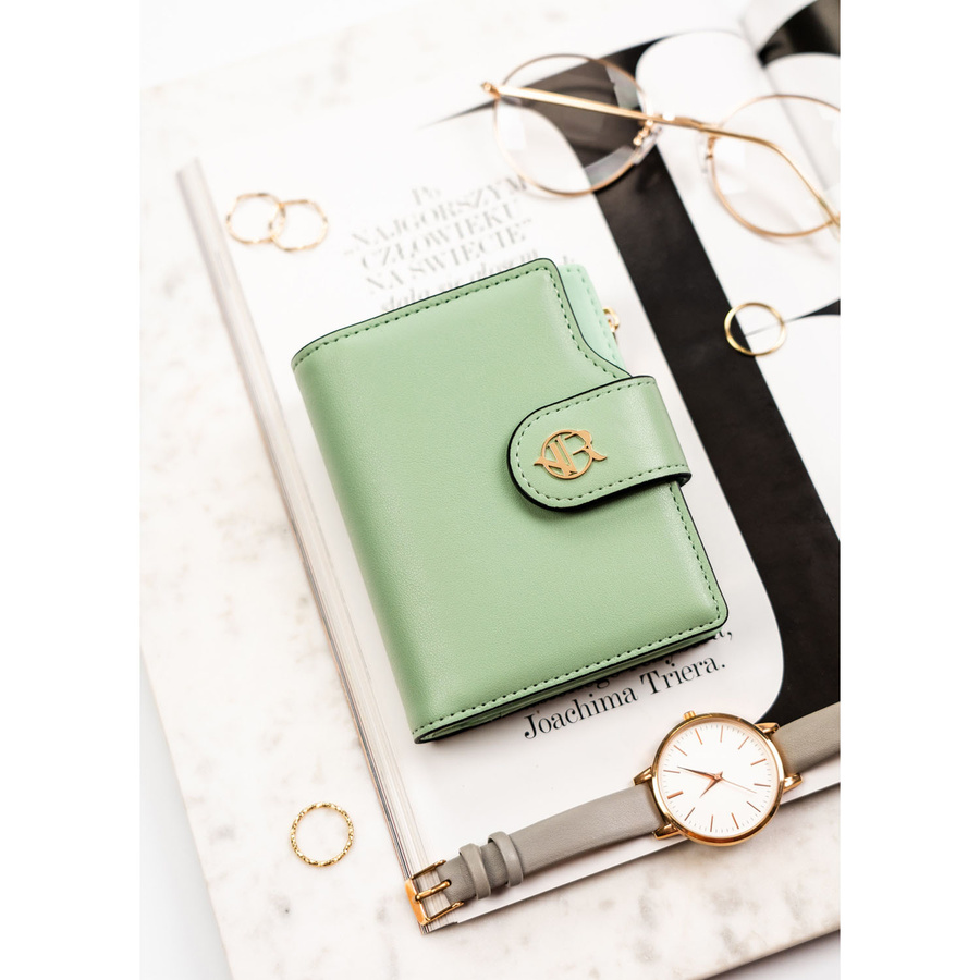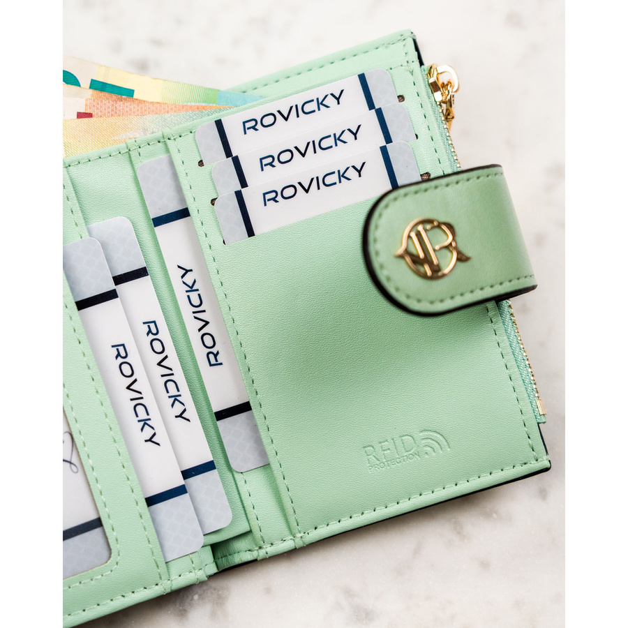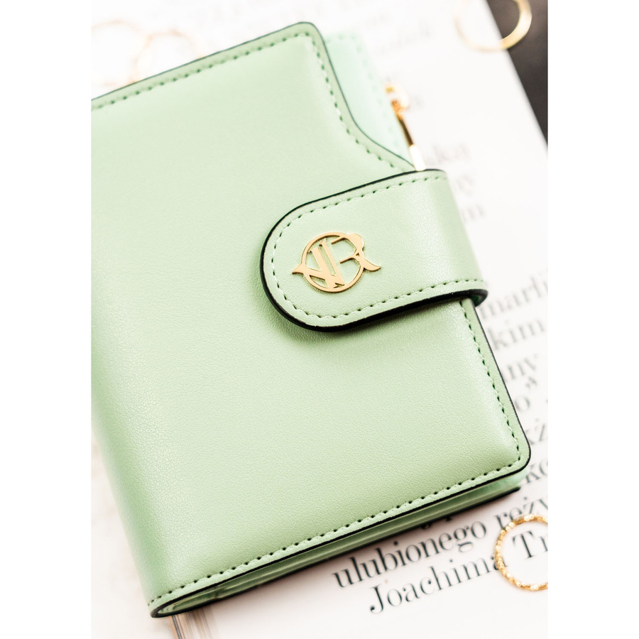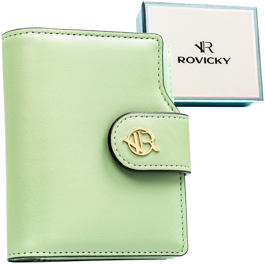 Pionowy portfel damski ze skóry ekologicznej w zielonym kolorze, zamykany na zatrzask i suwak - Rovicky