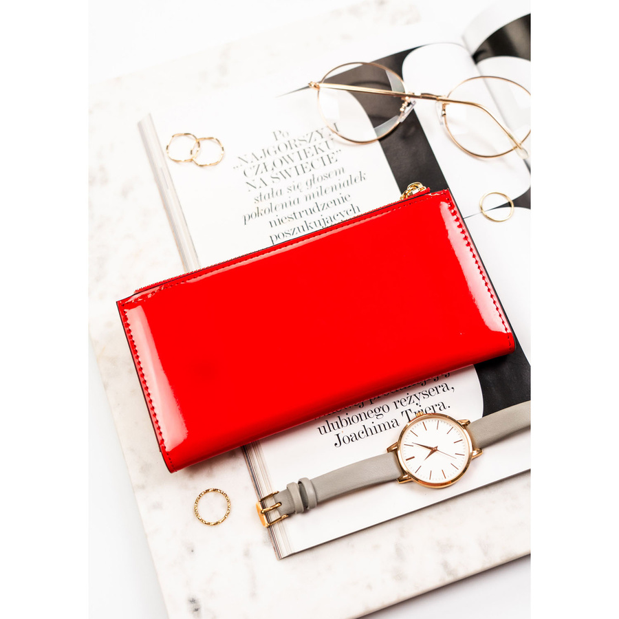 • Czerwony portfel damski w orientacji poziomej wykonany ze skóry ekologicznej. Model w typie piórnika zamykany na suwak i zatrzask. Wyposażony w system RFID. Portfel mieści dowód rejestracyjny.