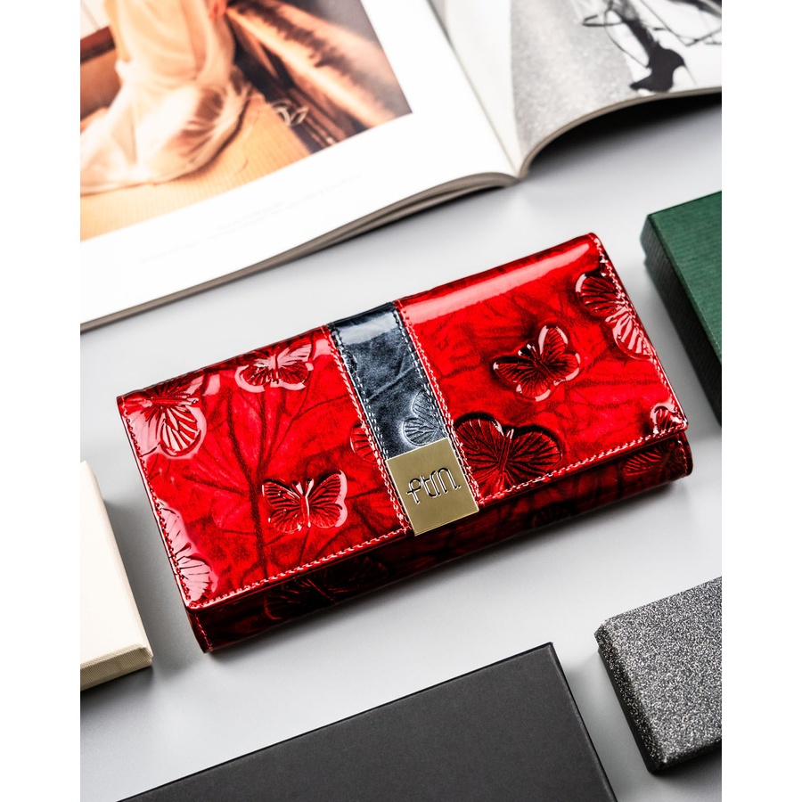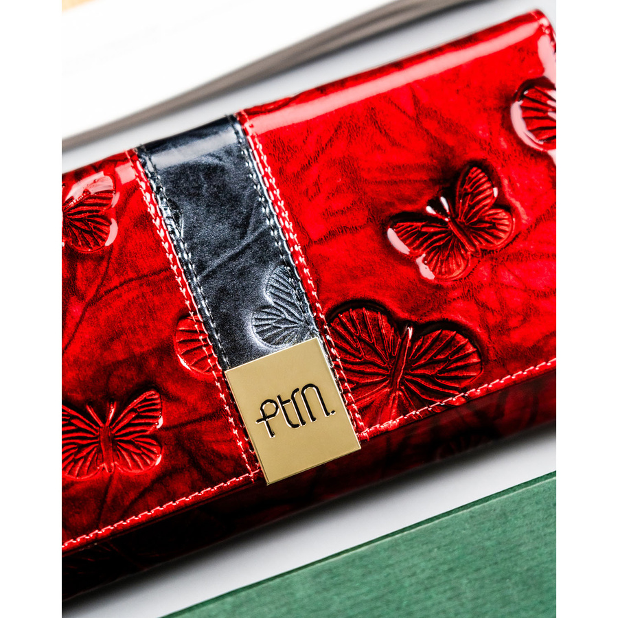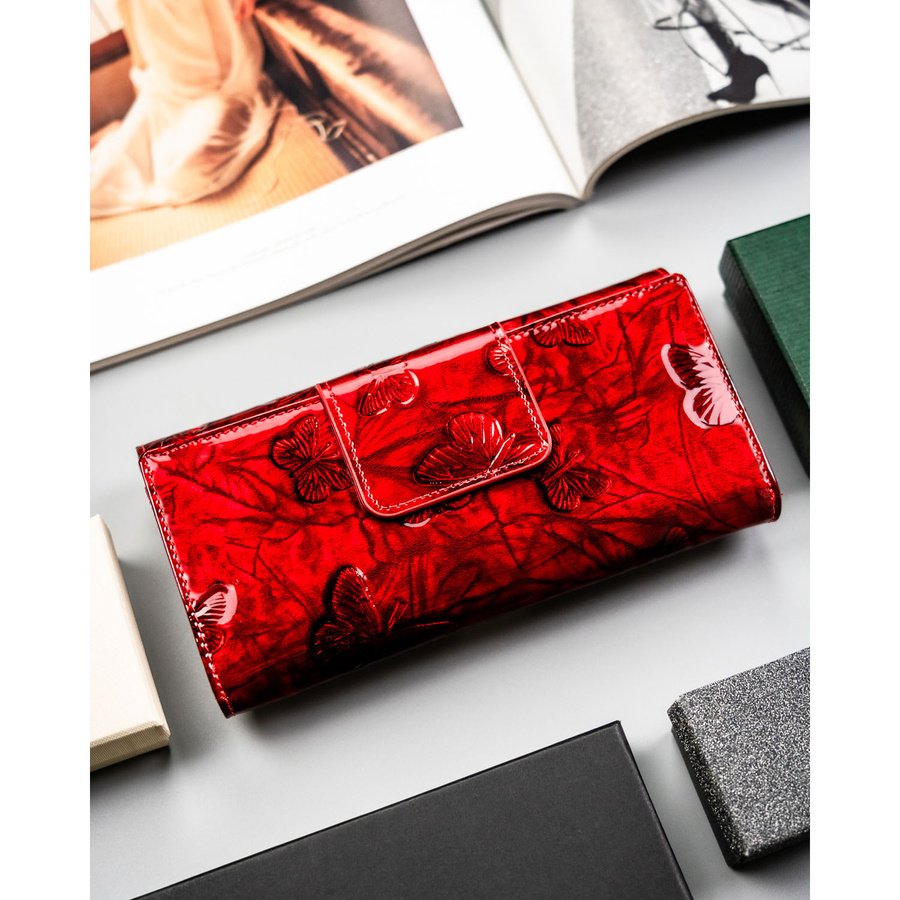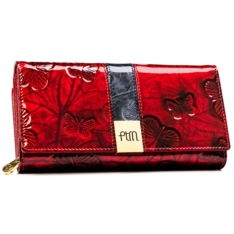 • Portfel uszyty ze skóry naturalnej w czerwonym kolorze. Pokryty tłoczonym wzorem w motylki i warstwą lakieru. Mieści dowód rejestracyjny i posiada aż 25 miejsc na karty. Wyposażony w technologię RFID BLOCKING SYSTEM.