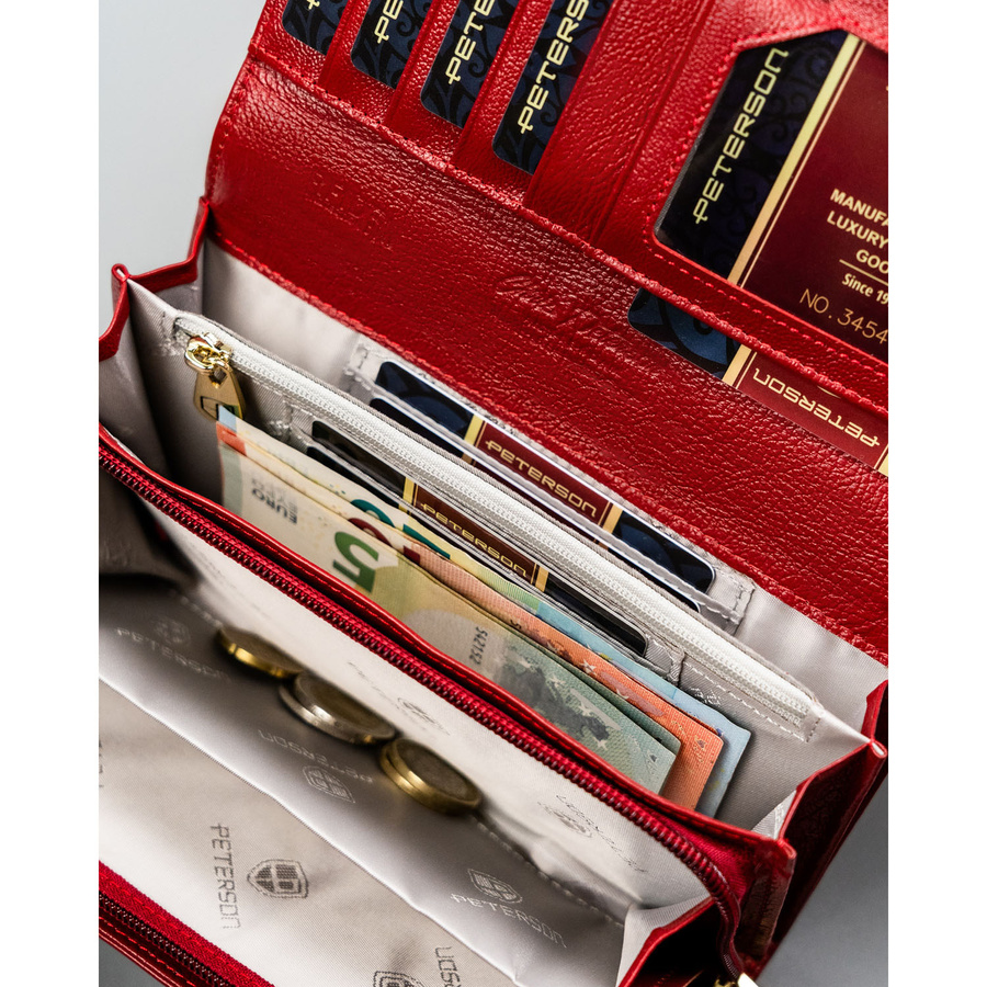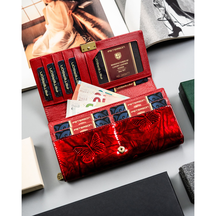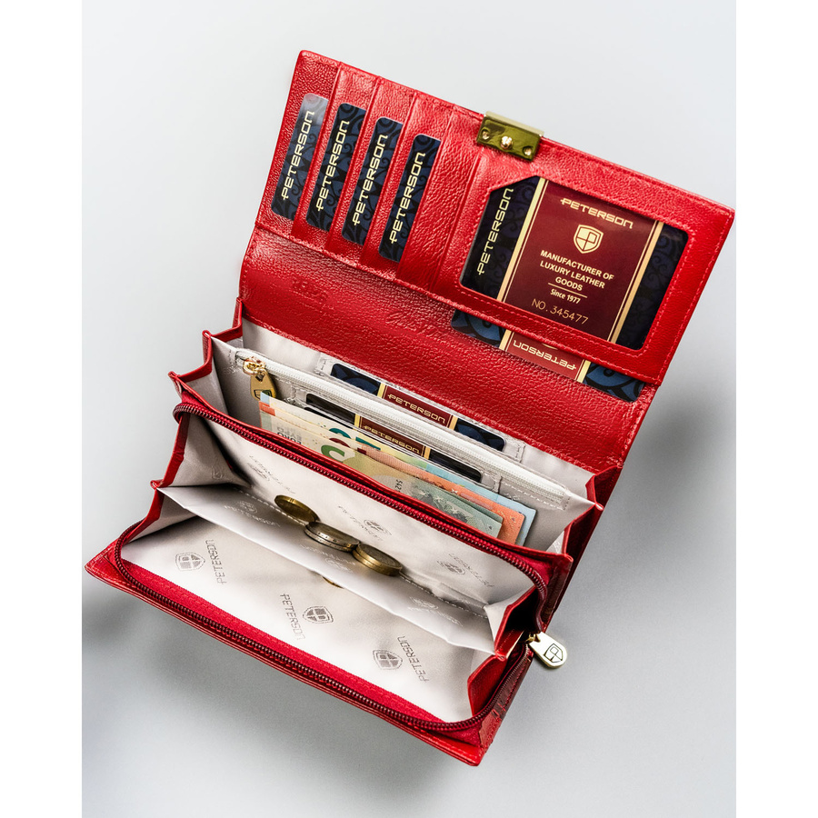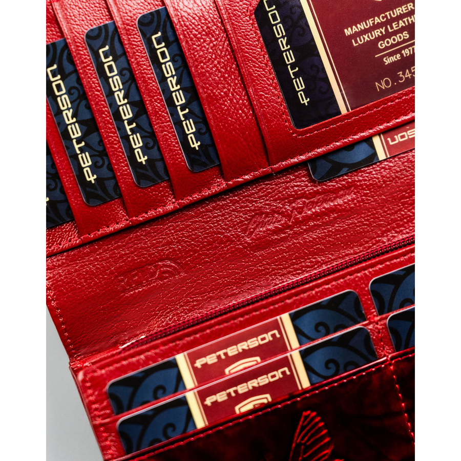 Duży portfel damski ze skóry naturalnej w czerwonym kolorze z ozdobnym tłoczeniem - Peterson