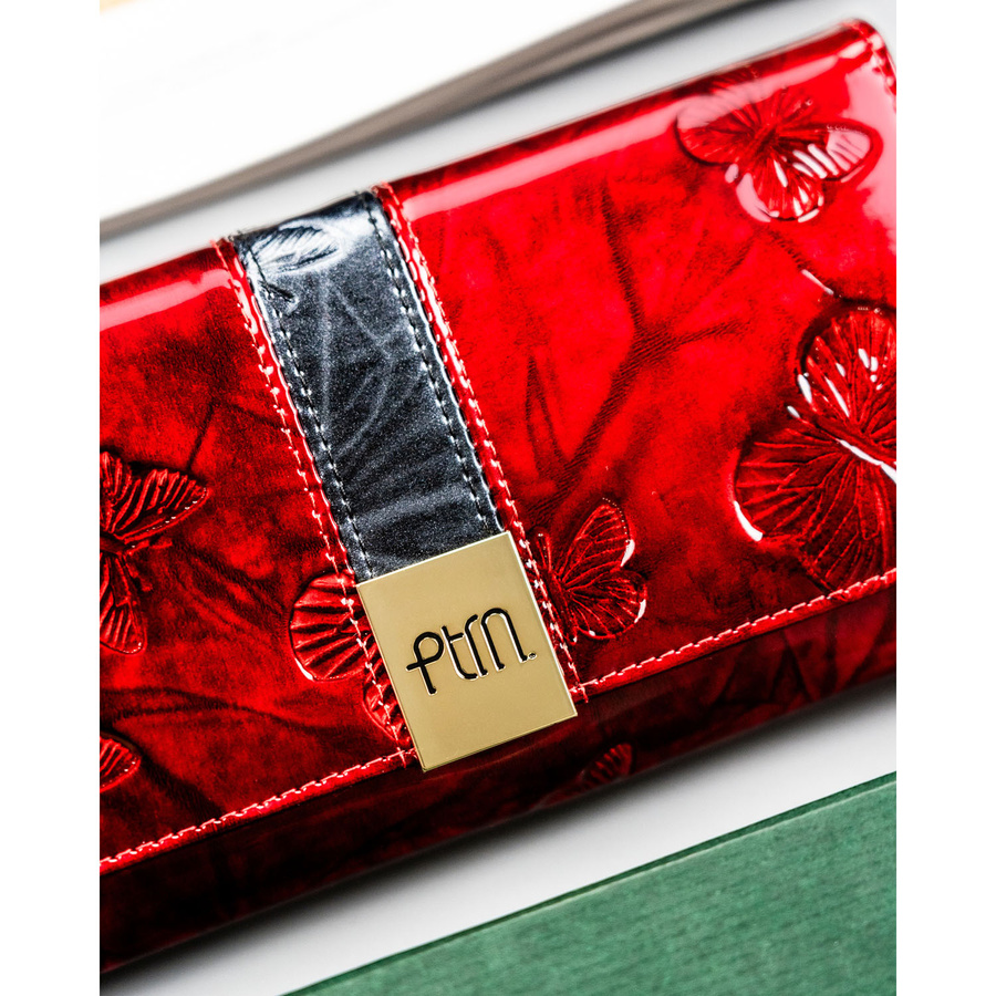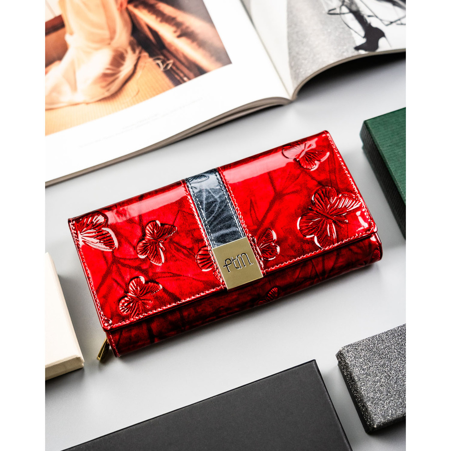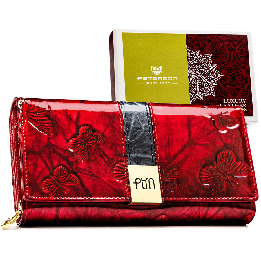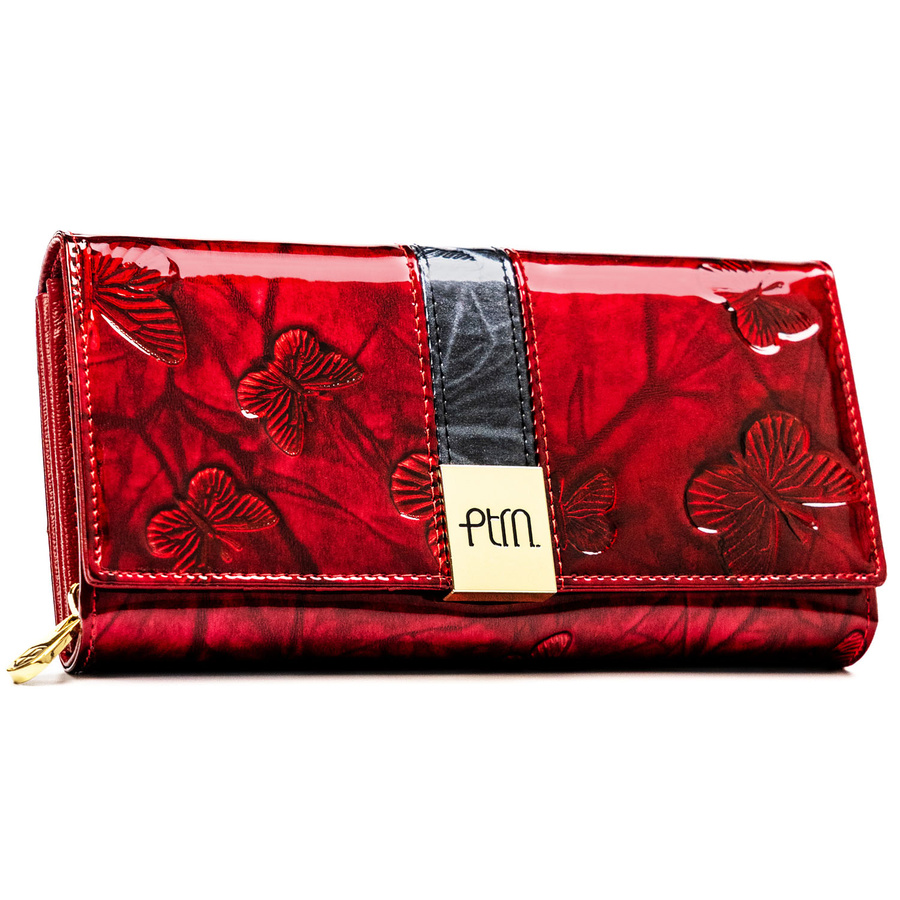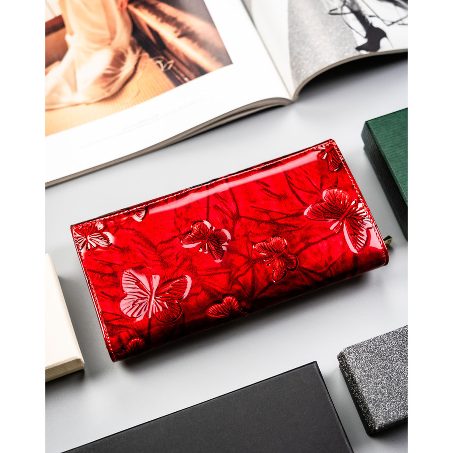 • Duży portfel damski uszyty z lakierowanej skóry naturalnej w czerwonym kolorze. Pokryty tłoczonym wzorem w motylki i warstwą lakieru. Mieści dowód rejestracyjny i posiada 13 miejsc na karty. Wyposażony w technologię RFID BLOCKING SYSTEM.