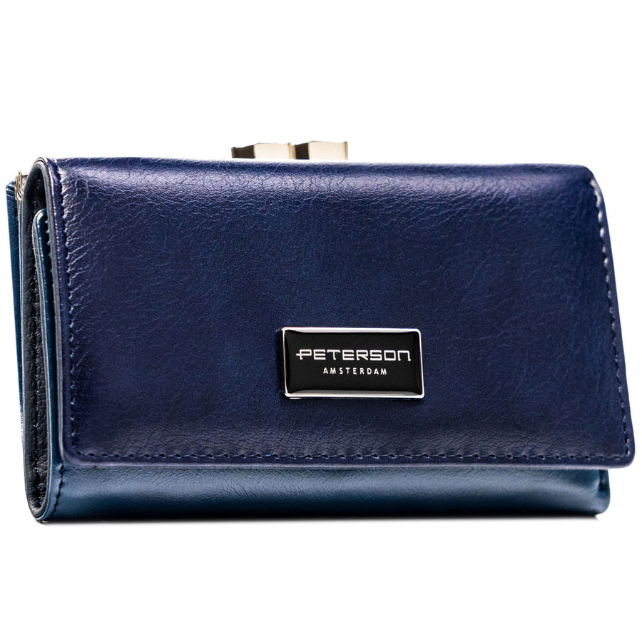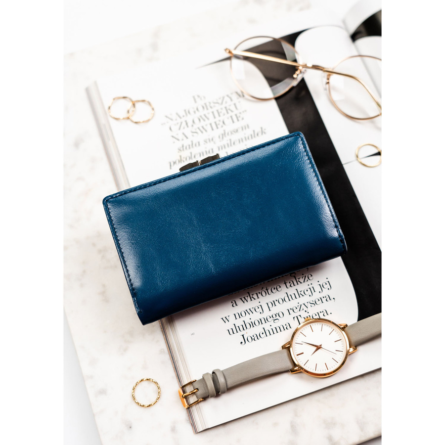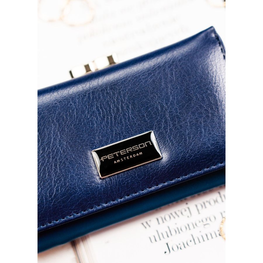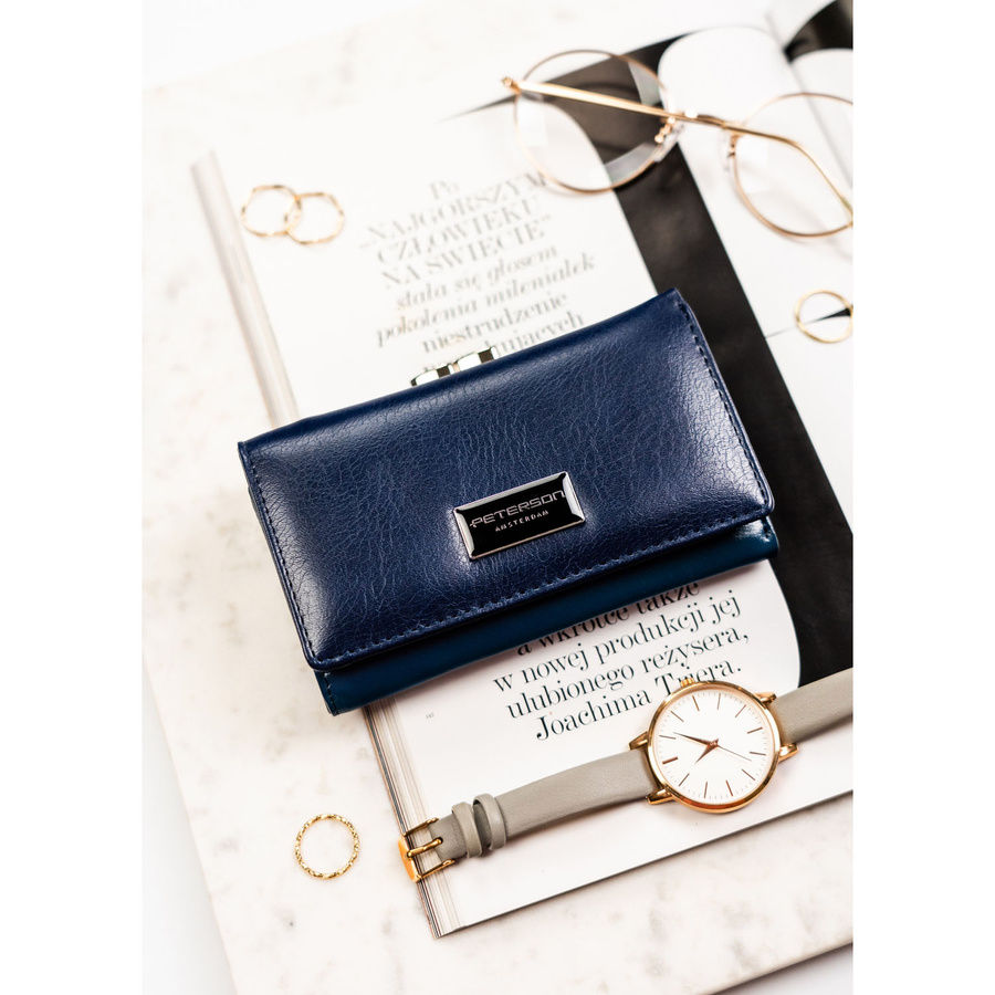 Portfel damski ze skóry naturalnej i ekologicznej w granatowym kolorze zamykany na zatrzask i bigiel - Peterson