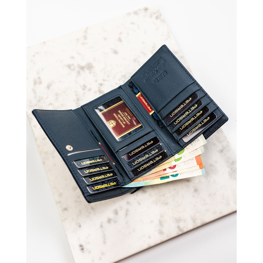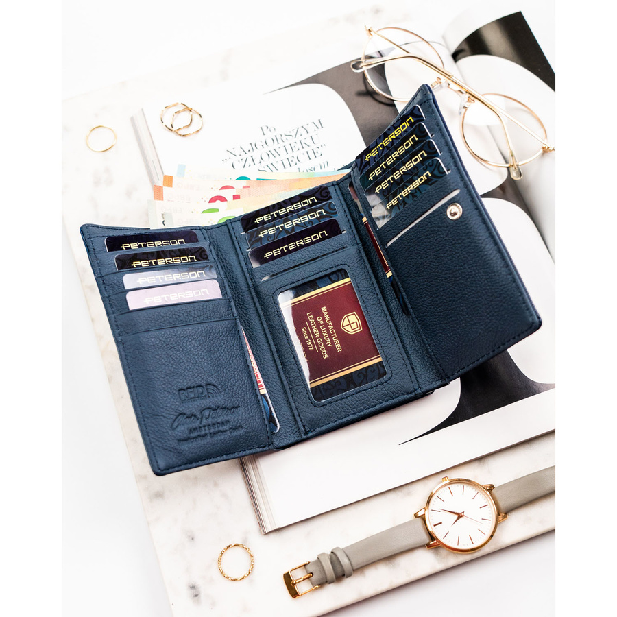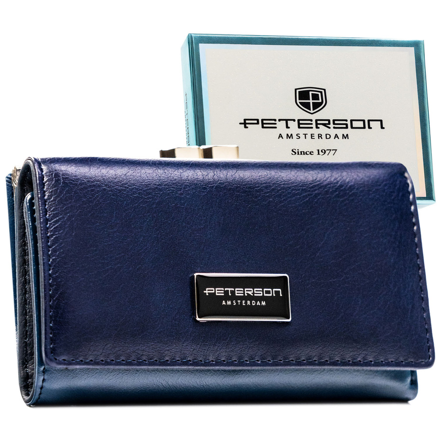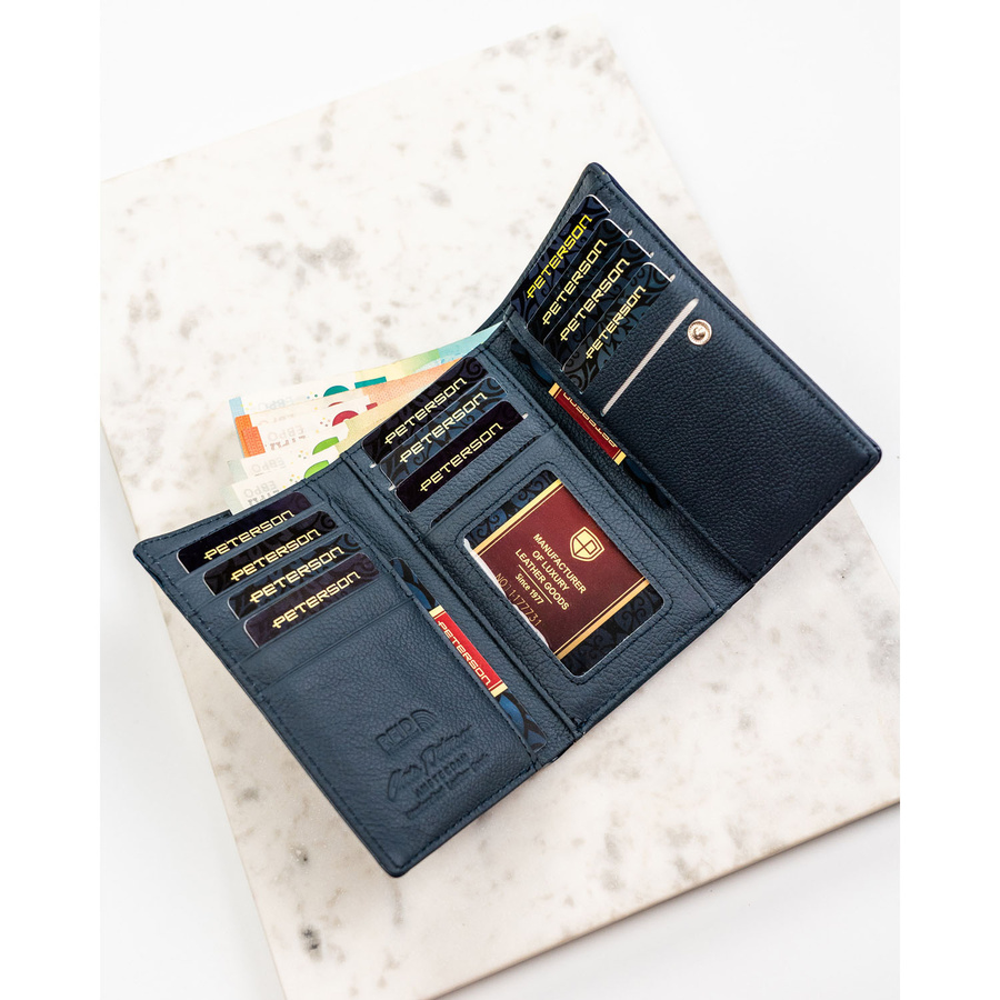 Portfel damski ze skóry naturalnej i ekologicznej w granatowym kolorze zamykany na zatrzask i bigiel - Peterson