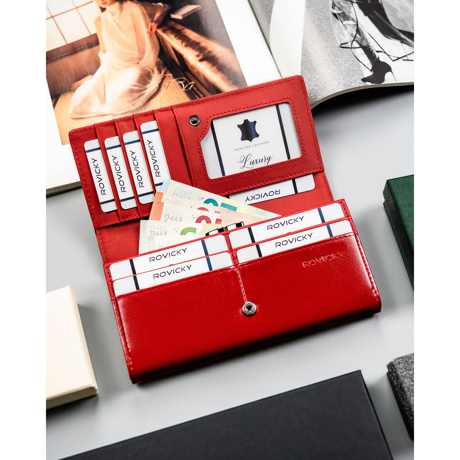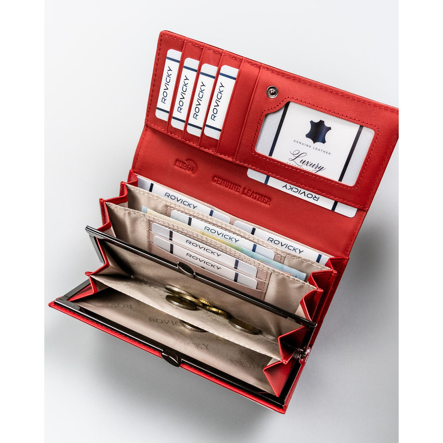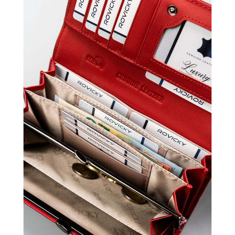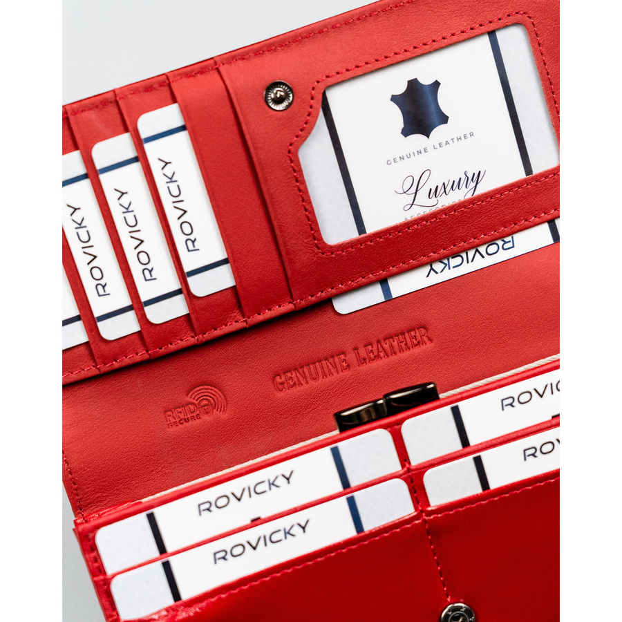 Czerwony portfel damski ze skóry naturalnej i ekologicznej wyposażony w system RFID, zamykany na zatrzask - Rovicky