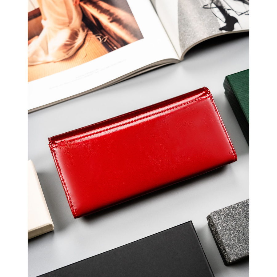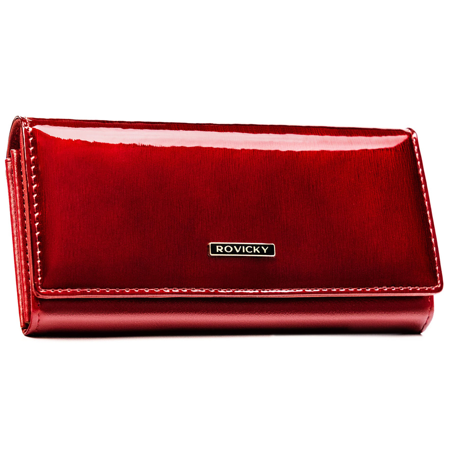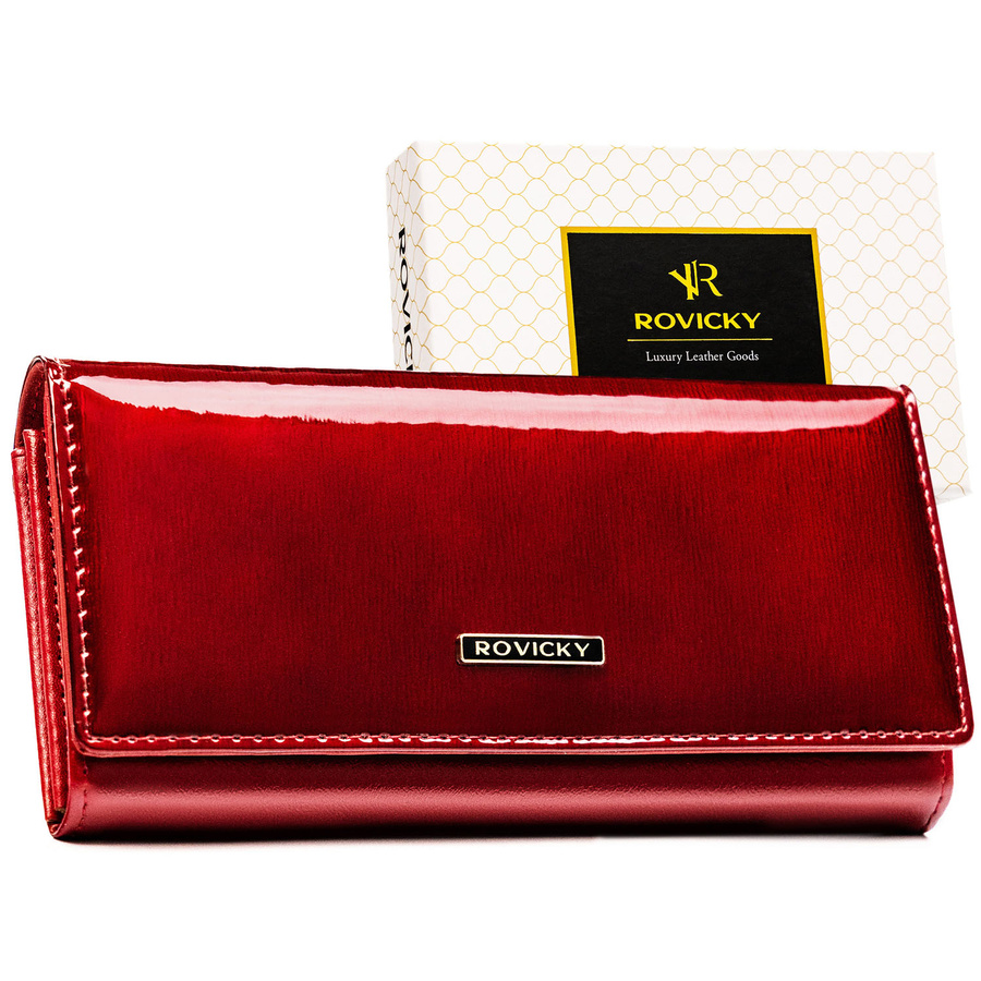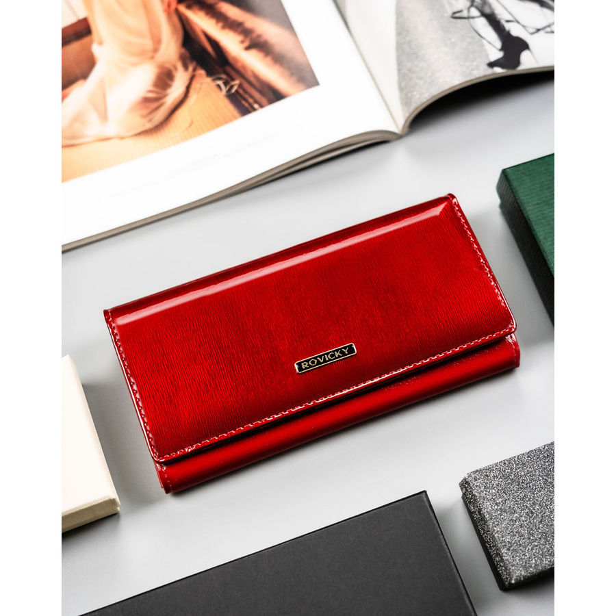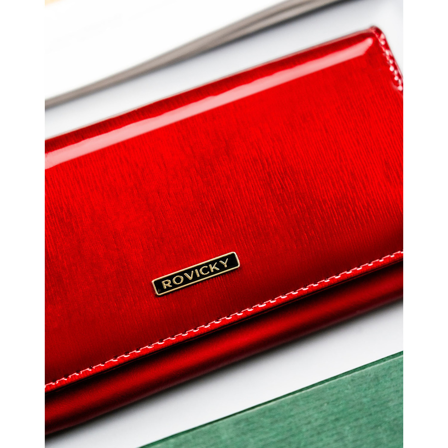 Czerwony portfel damski ze skóry naturalnej i ekologicznej wyposażony w system RFID, zamykany na zatrzask - Rovicky
