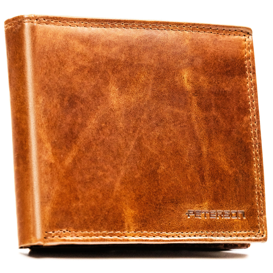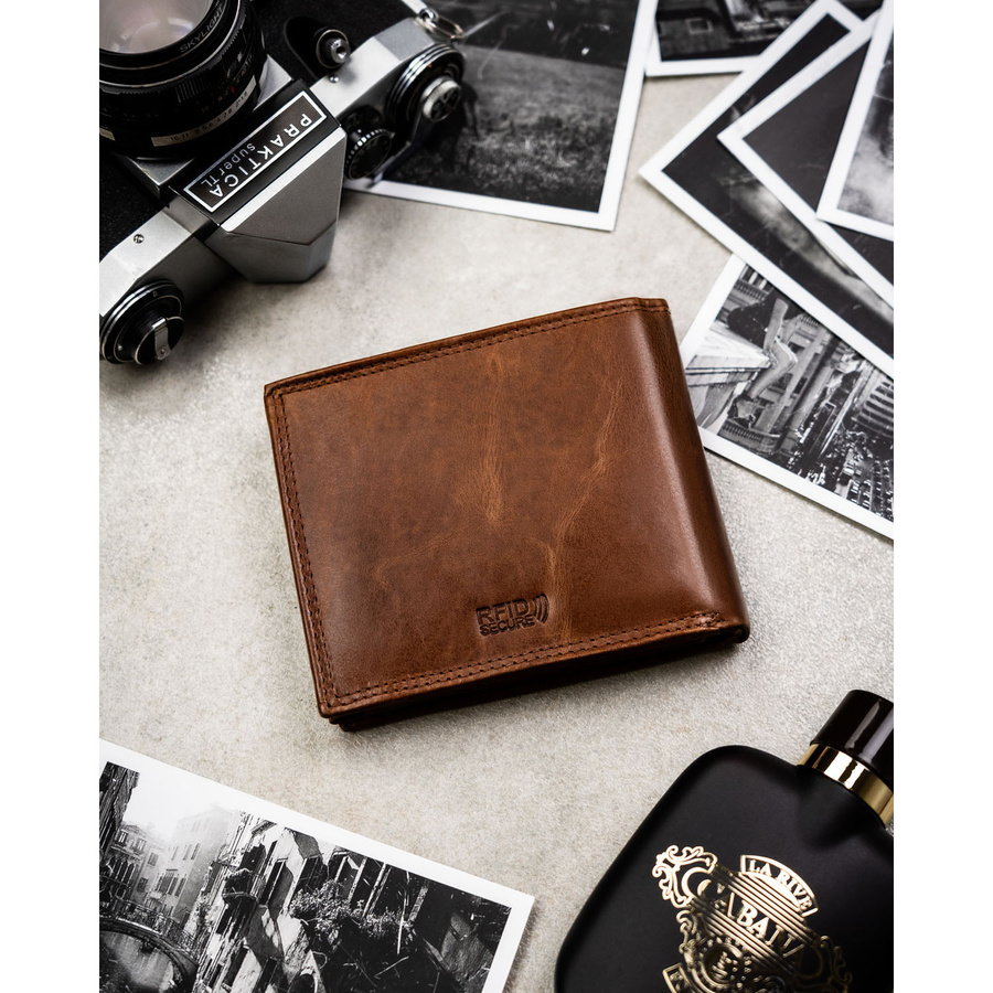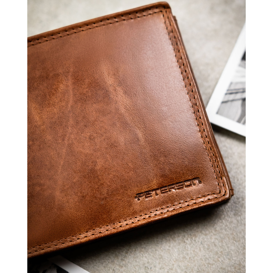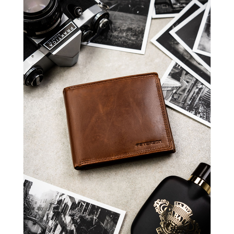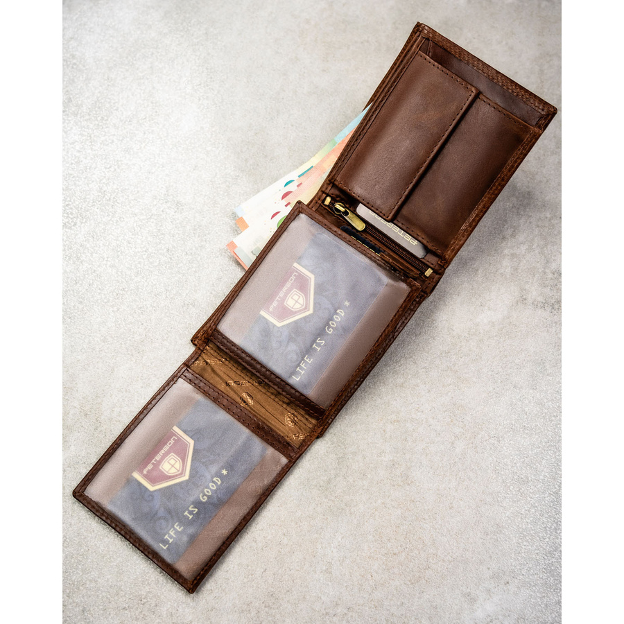Duży, brązowy, skórzany portfel męski wyposażony w system RFID - Peterson