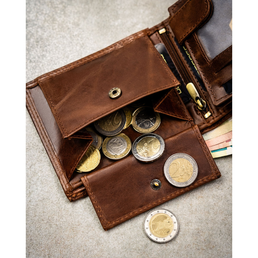 - 2 oddzielne kieszenie na banknoty, co pozwala wygodnie segregować waluty.