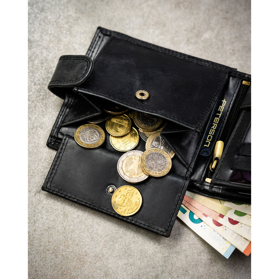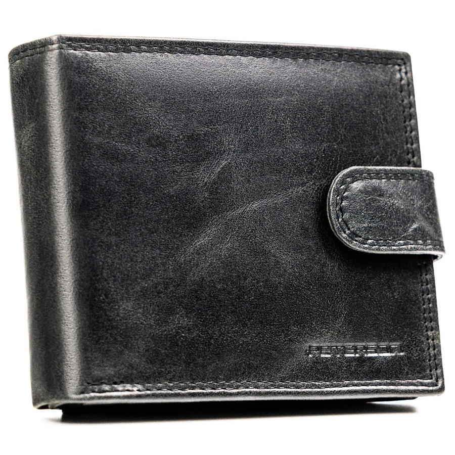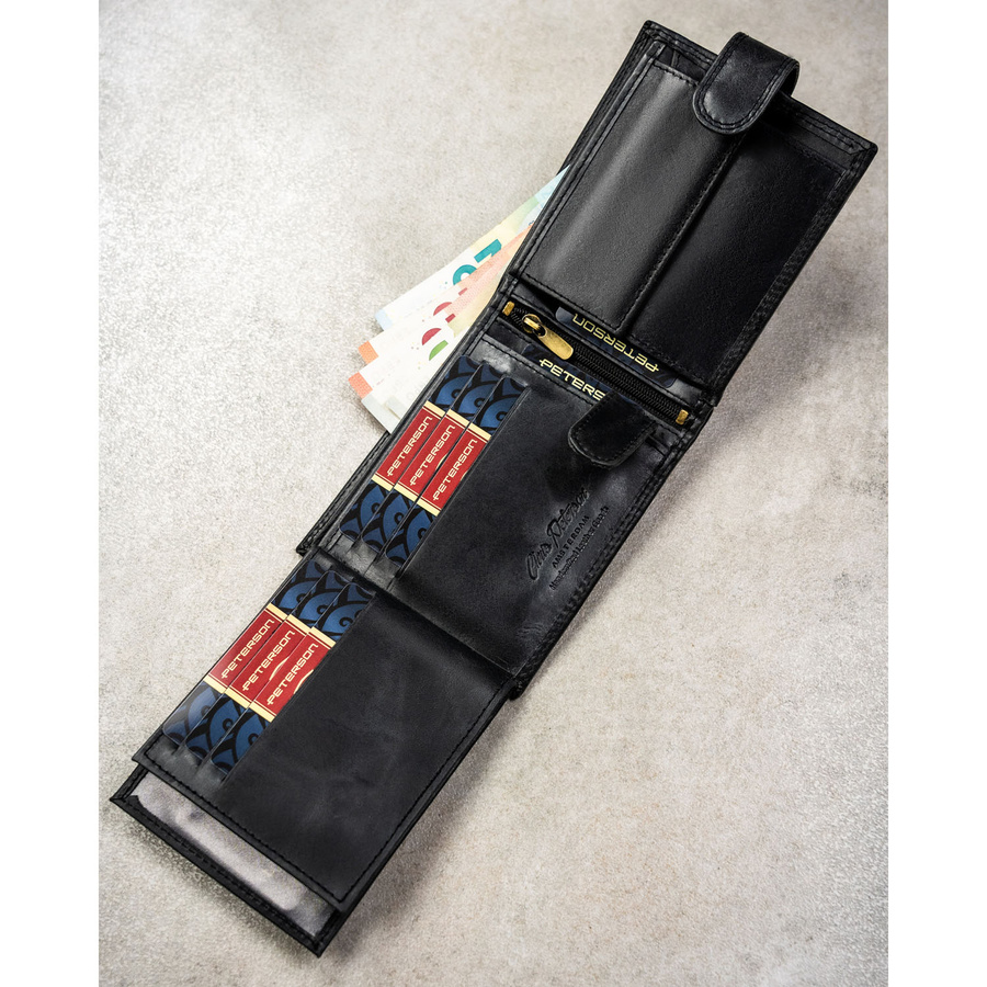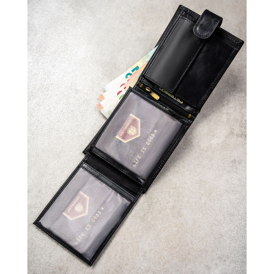 Skórzany portfel męski w czarnym kolorze, wyposażony w system RFID i zamykany zatrzaskiem - Peterson