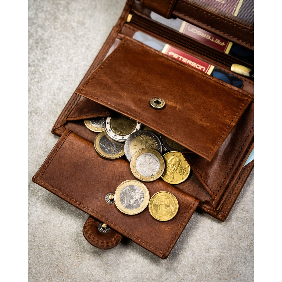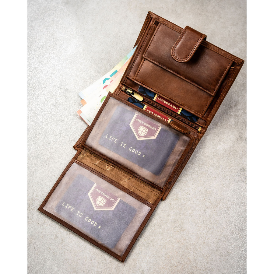 Pionowy portfel męski ze skóry naturalnej w brązowym kolorze zamykany na zatrzask - Peterson