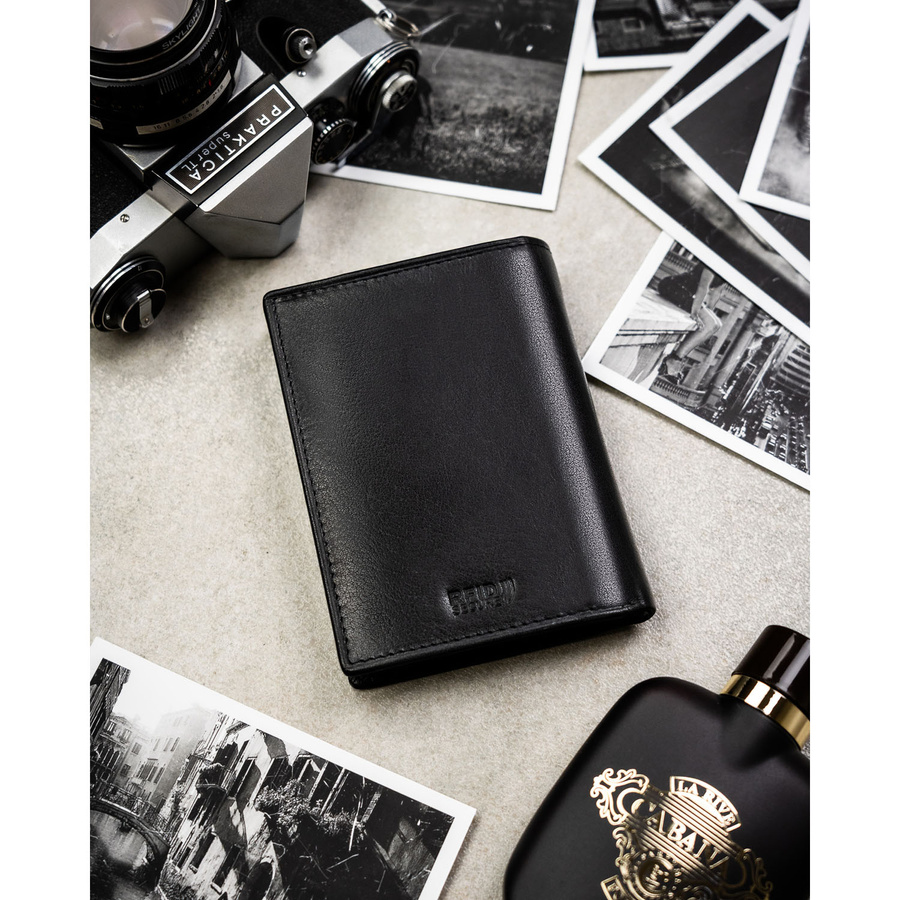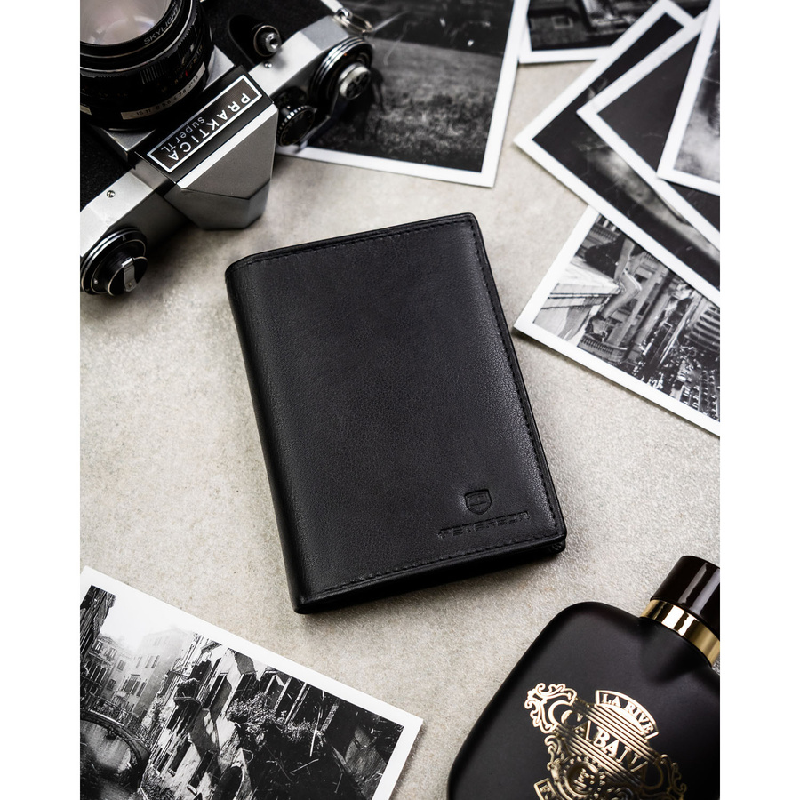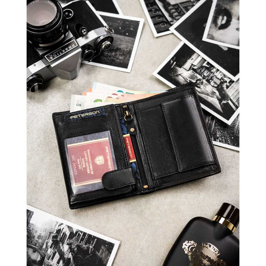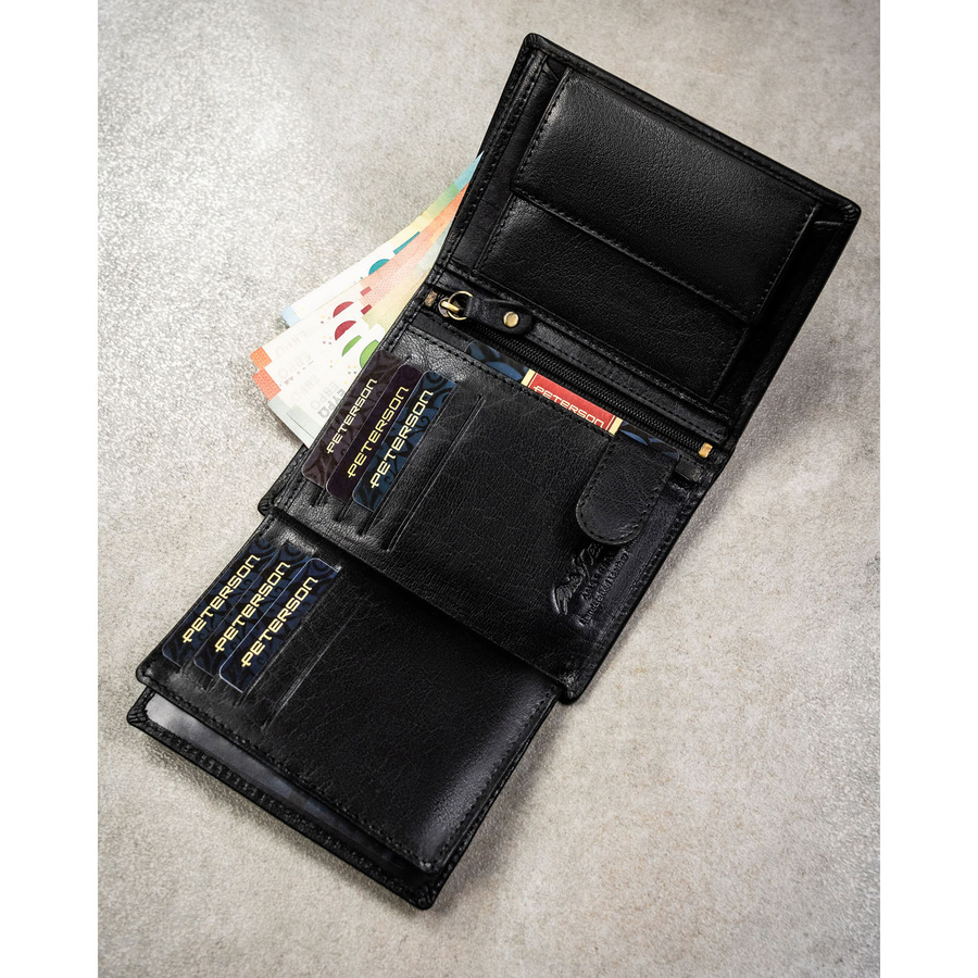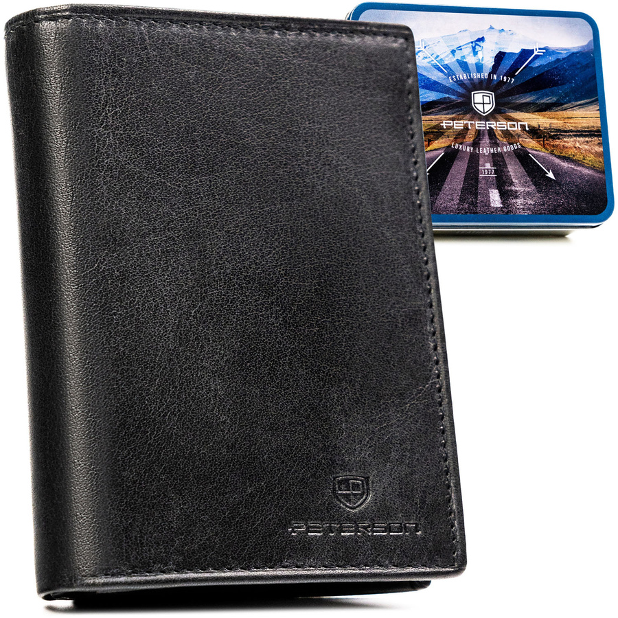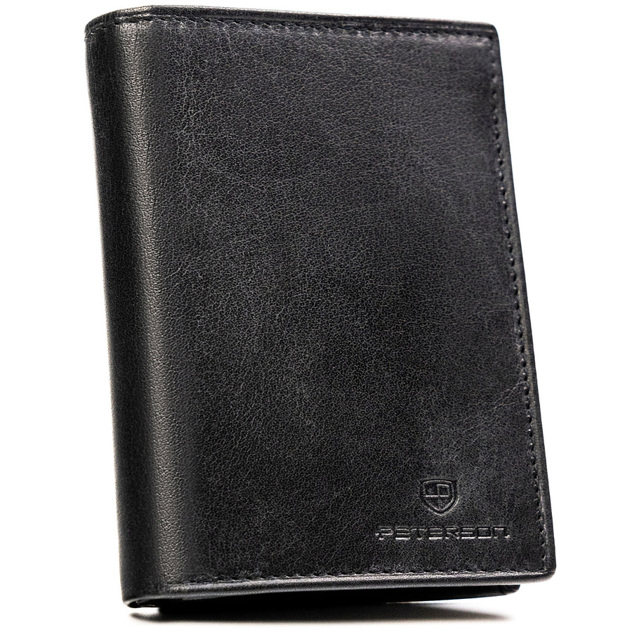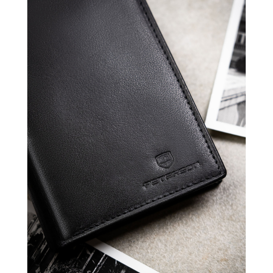 Elegancki, skórzany portfel męski w czarnym kolorze bez zapięcia zewnętrznego - Peterson
