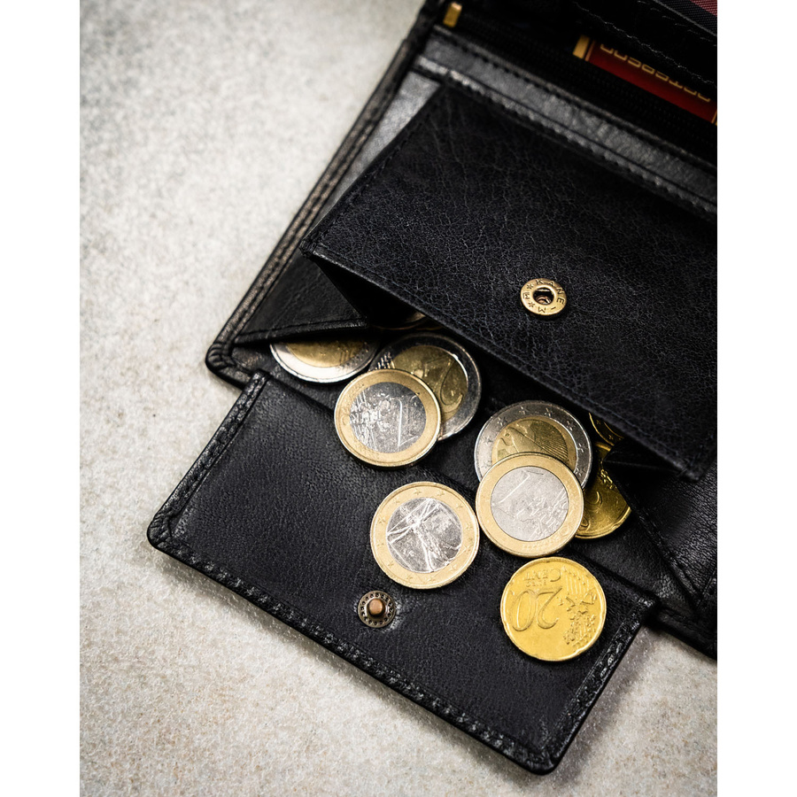 - Na monety czeka zamykana kieszonka na bilon, dzięki której drobne nie rozsypią się w torbie czy kieszeni.