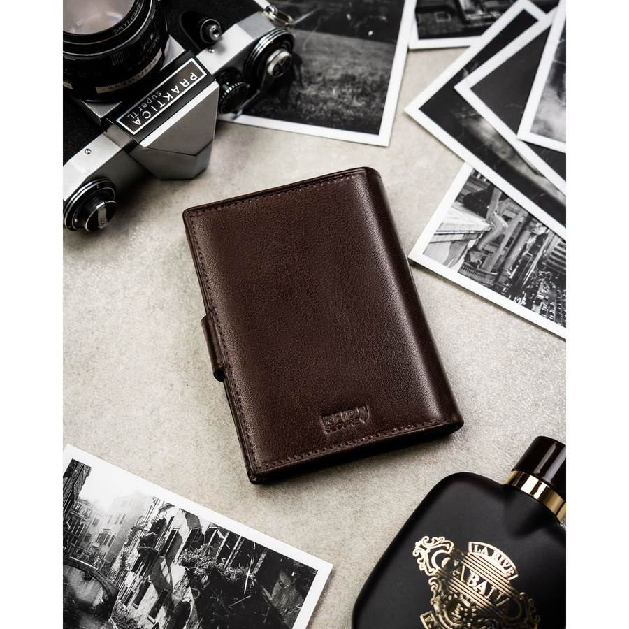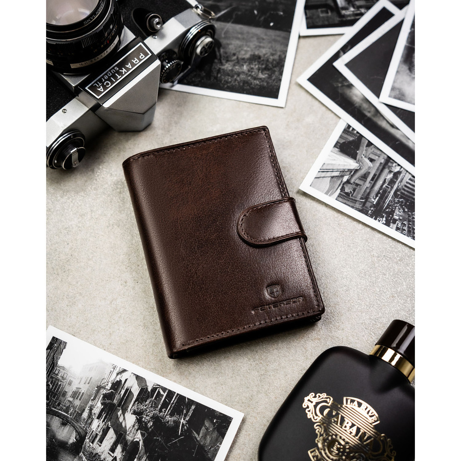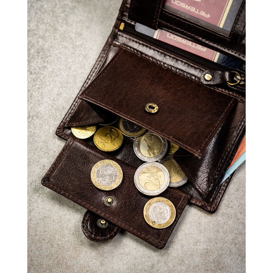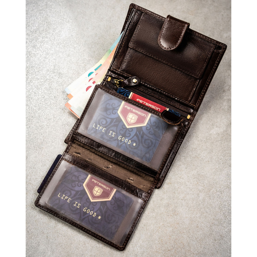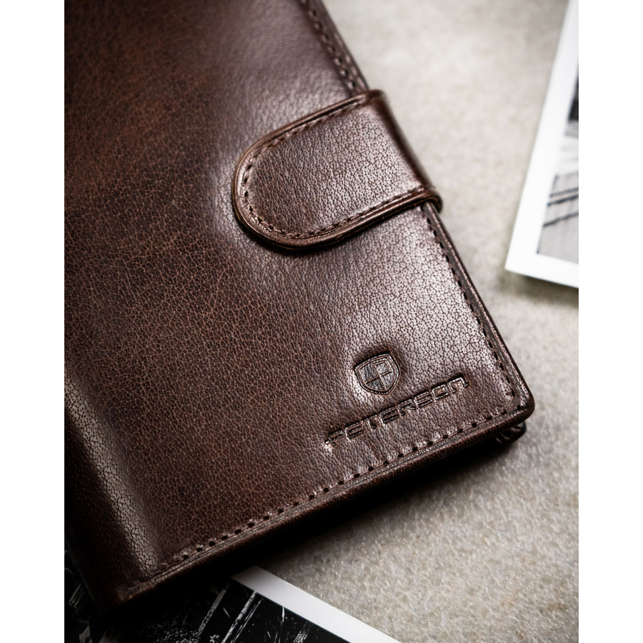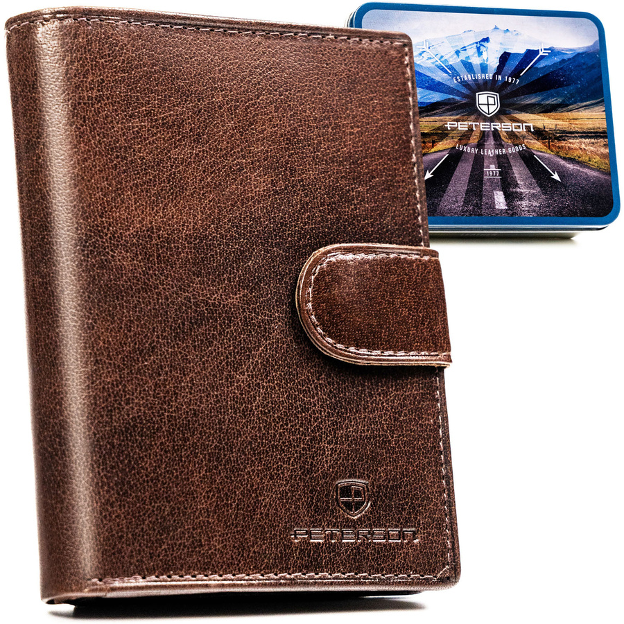 Klasyczny, skórzany portfel męski w brązowym kolorze zamykany zatrzaskiem - Peterson