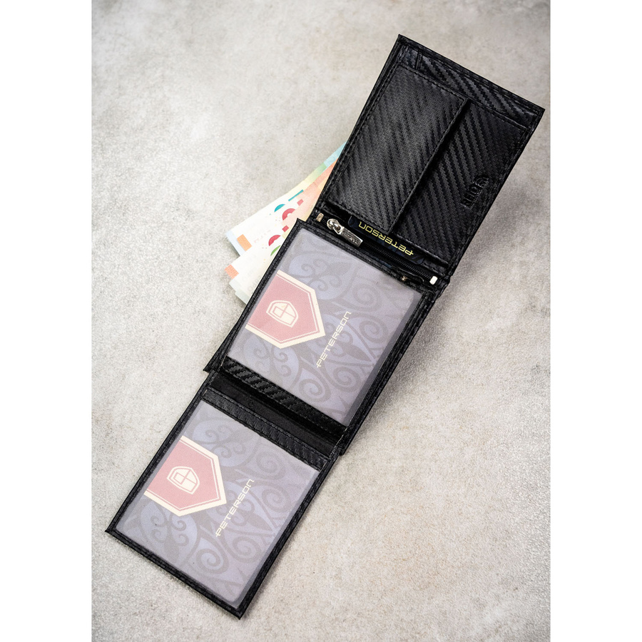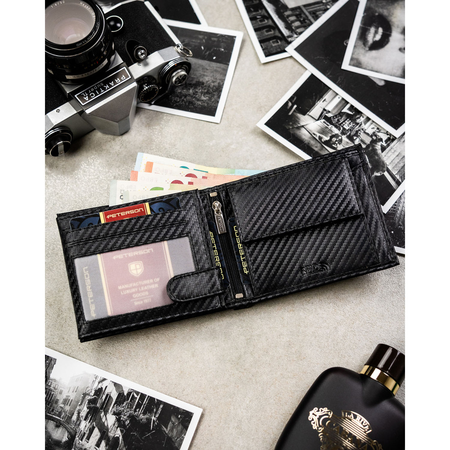 Duży portfel męski ze skóry naturalnej w czarnym kolorze bez zapięcia zewnętrznego, w zestawie z brelokiem - Peterson