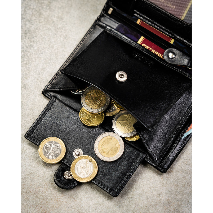 - bilon przechowasz w 1 kieszeni zamykanej na zatrzask – monety pozostają na swoim miejscu;