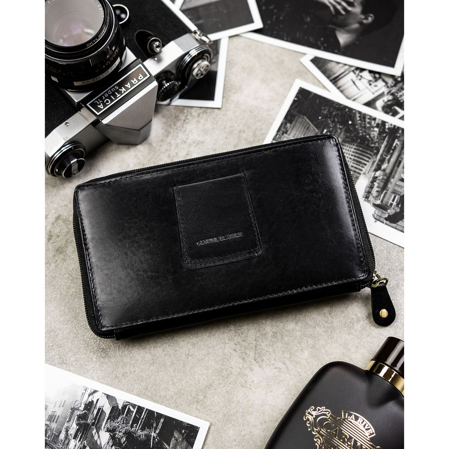 - Sekcja pierwsza – pojemna część zamykana solidnym zamkiem błyskawicznym. Znajdziesz w niej liczne przegródki przeznaczone na karty, dokumenty oraz gotówkę.