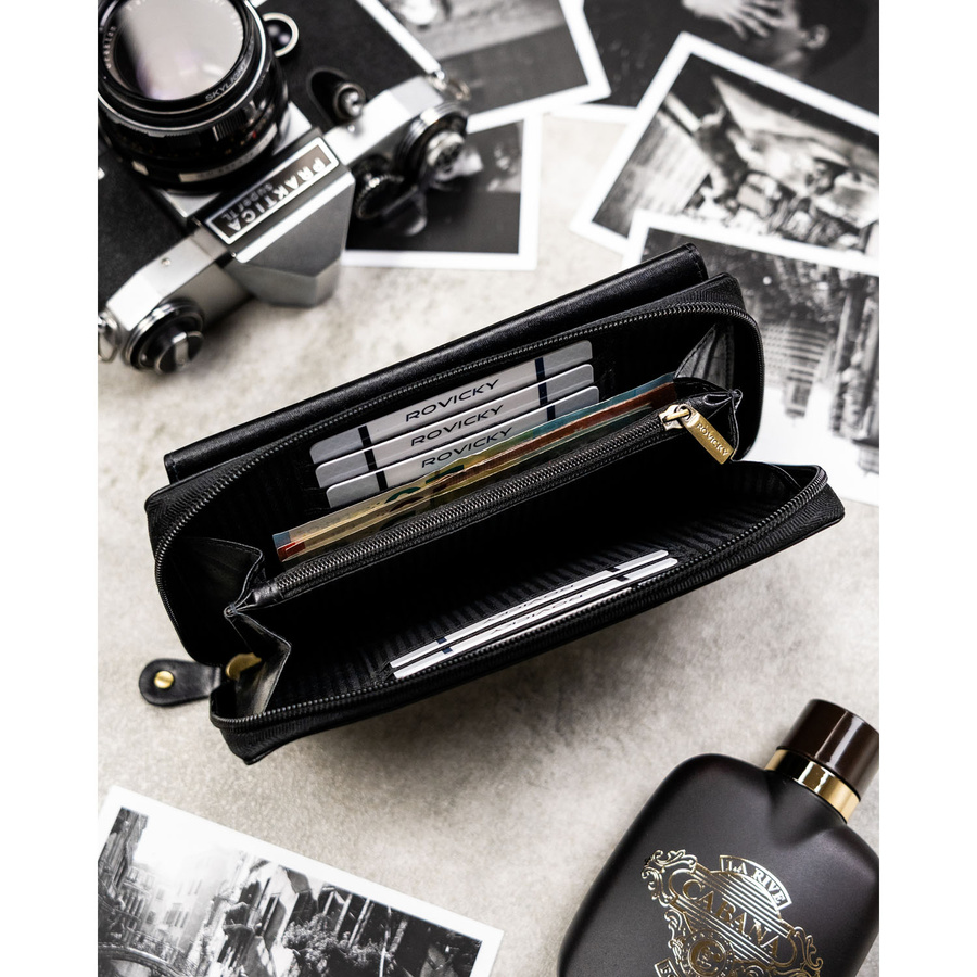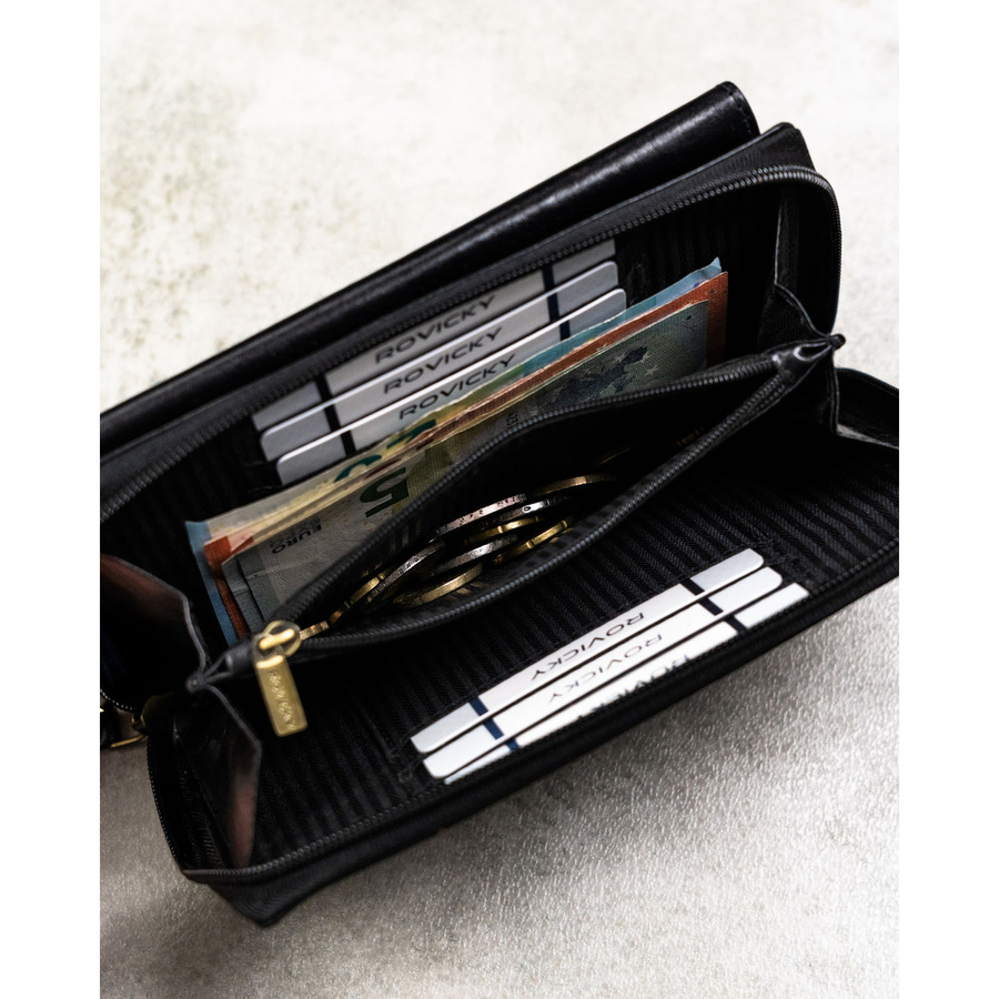 - 8 dedykowanych przegródek na karty płatnicze, wizytówki lub dokumenty w standardowym formacie (np. dowód osobisty, prawo jazdy),