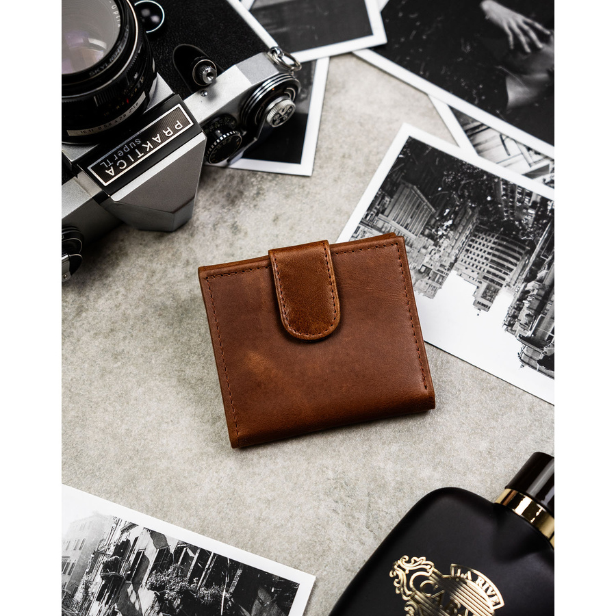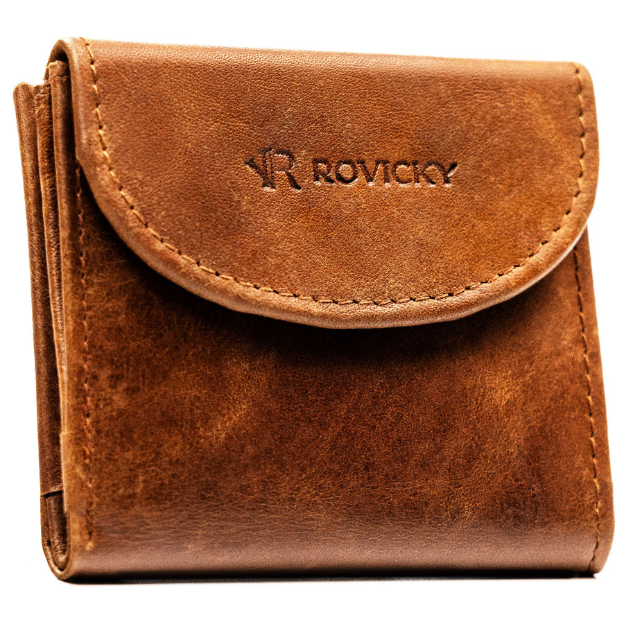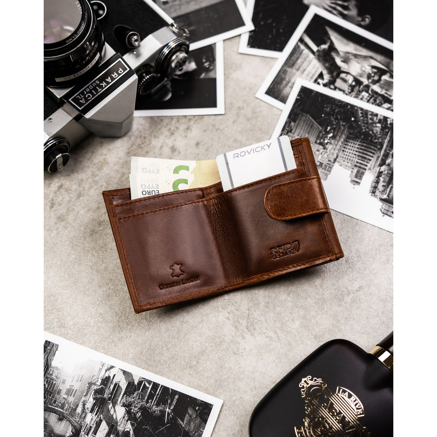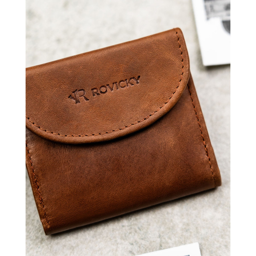 Mały i cienki, skórzany portfel męski w brązowym kolorze zamykany zatrzaskiem - Rovicky