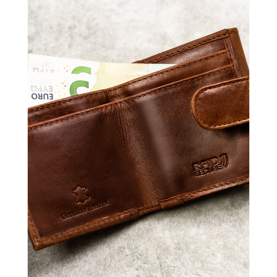 • Niewielki portfel męski wykonany ze skóry naturalnej w brązowym kolorze. Cienki i poręczny, zmieści się w kieszeni spodni. Portfel zamykany na zatrzask i wyposażony w system RFID. Model nie mieści dowodu rejestracyjnego.