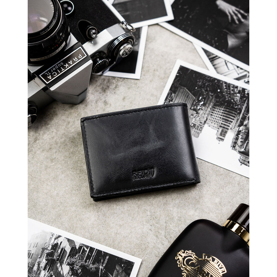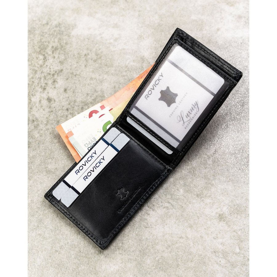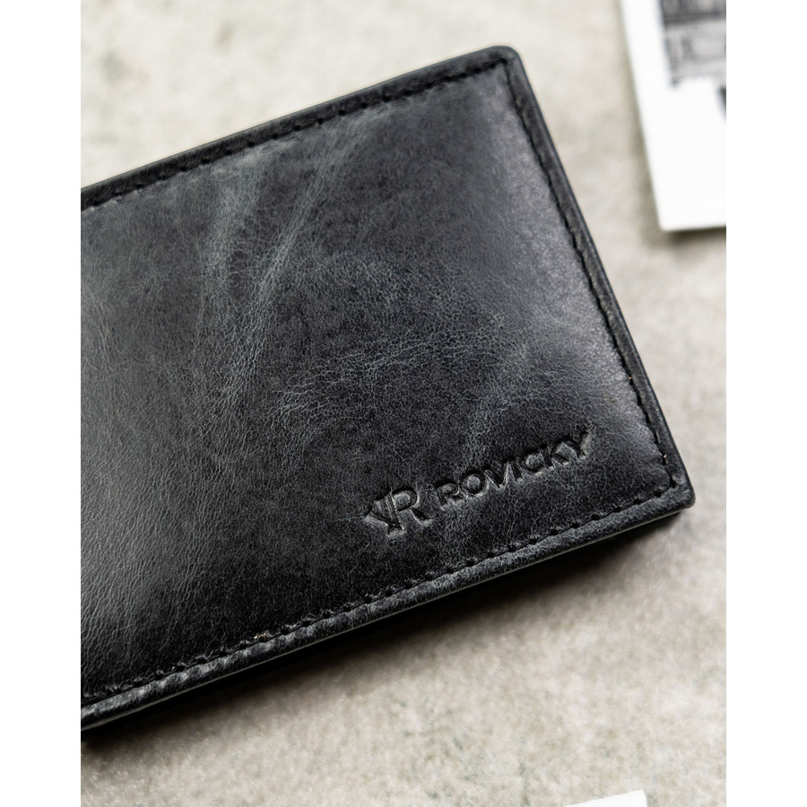 Skórzany portfel męski w czarnym kolorze bez zapięcia zewnętrznego - Rovicky