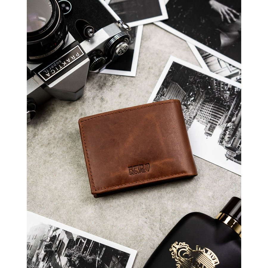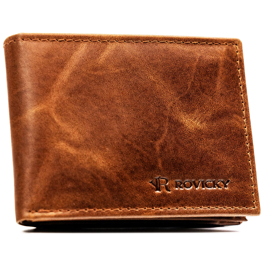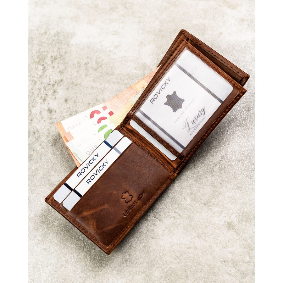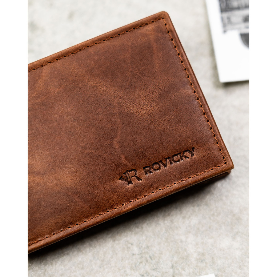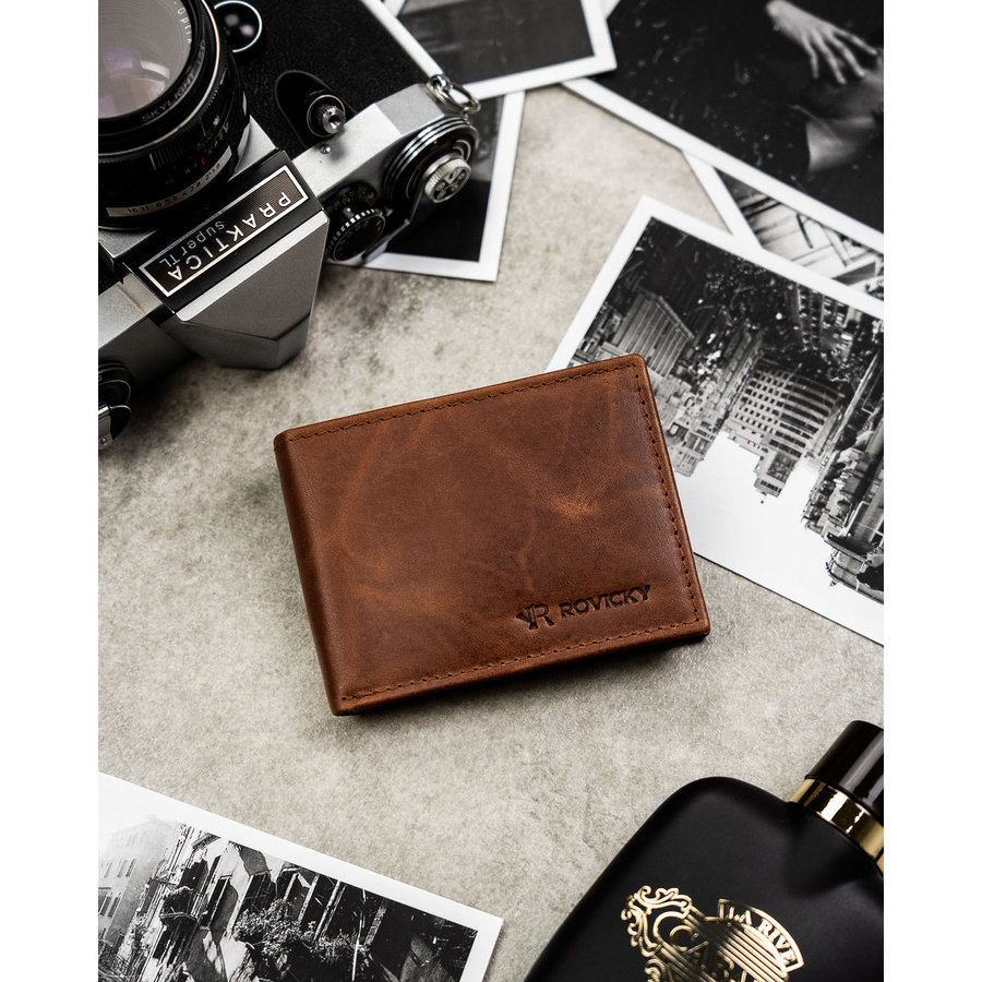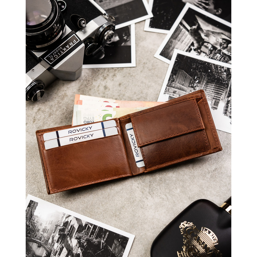 Skórzany portfel męski w brązowym kolorze bez zapięcia zewnętrznego - Rovicky