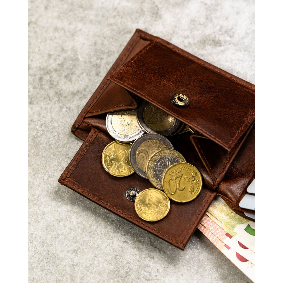 • Portfel męski wykonany ze skóry naturalnej w brązowym kolorze. Model bez zapięcia zewnętrznego. Mały i kompaktowy, zmieści się w kieszeni spodni. Model nie mieści dowodu rejestracyjnego.