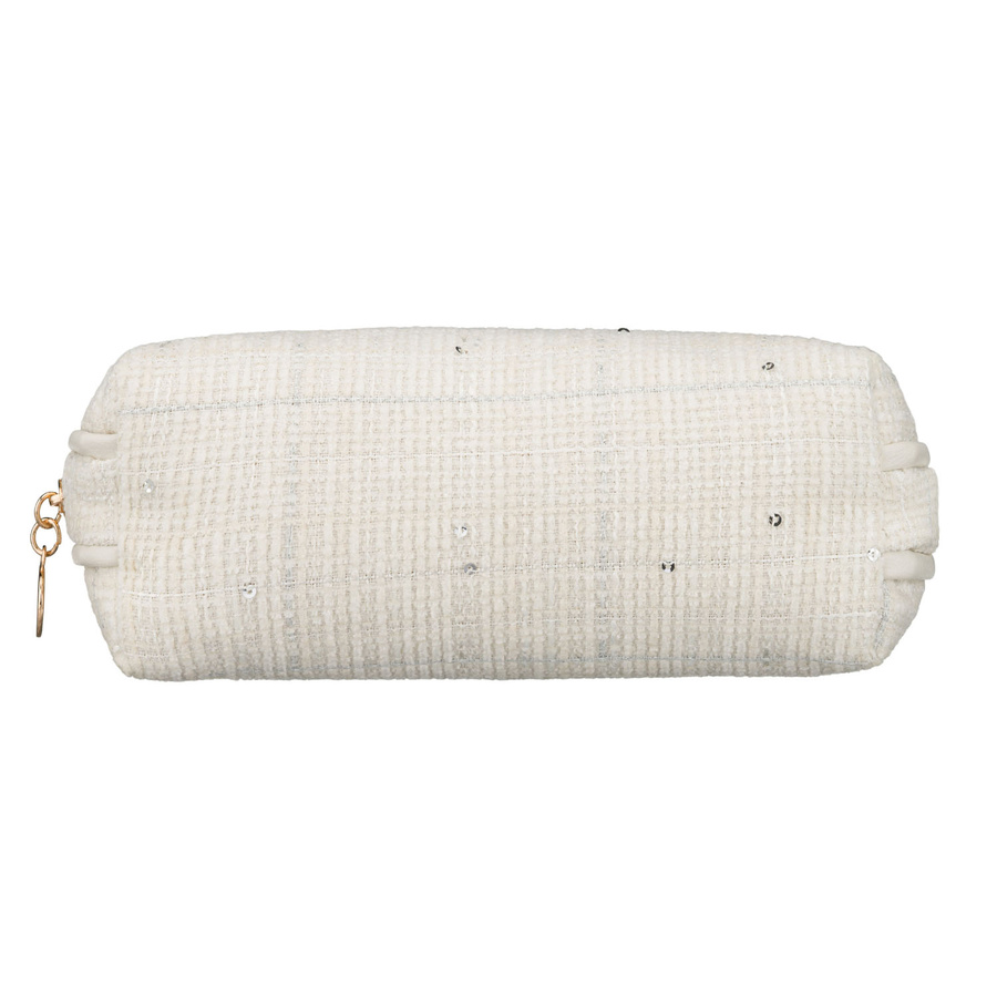 Beżowa kosmetyczka damska wykonana z materiału syntetycznego z ozdobnymi cekinami - Rovicky