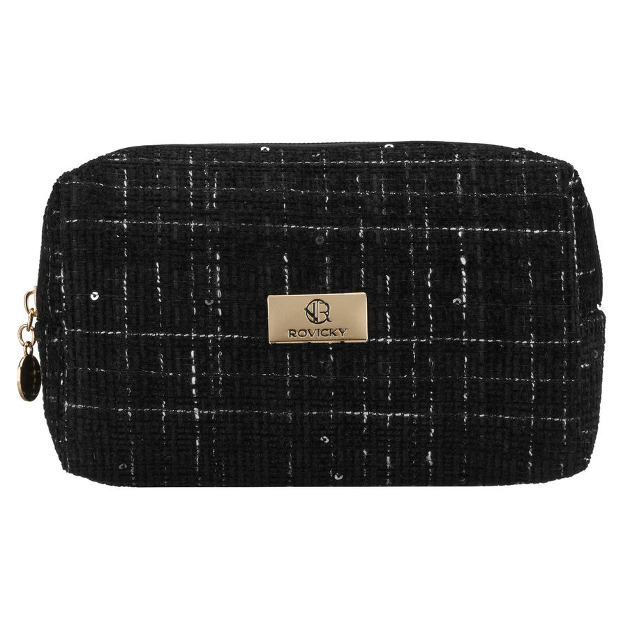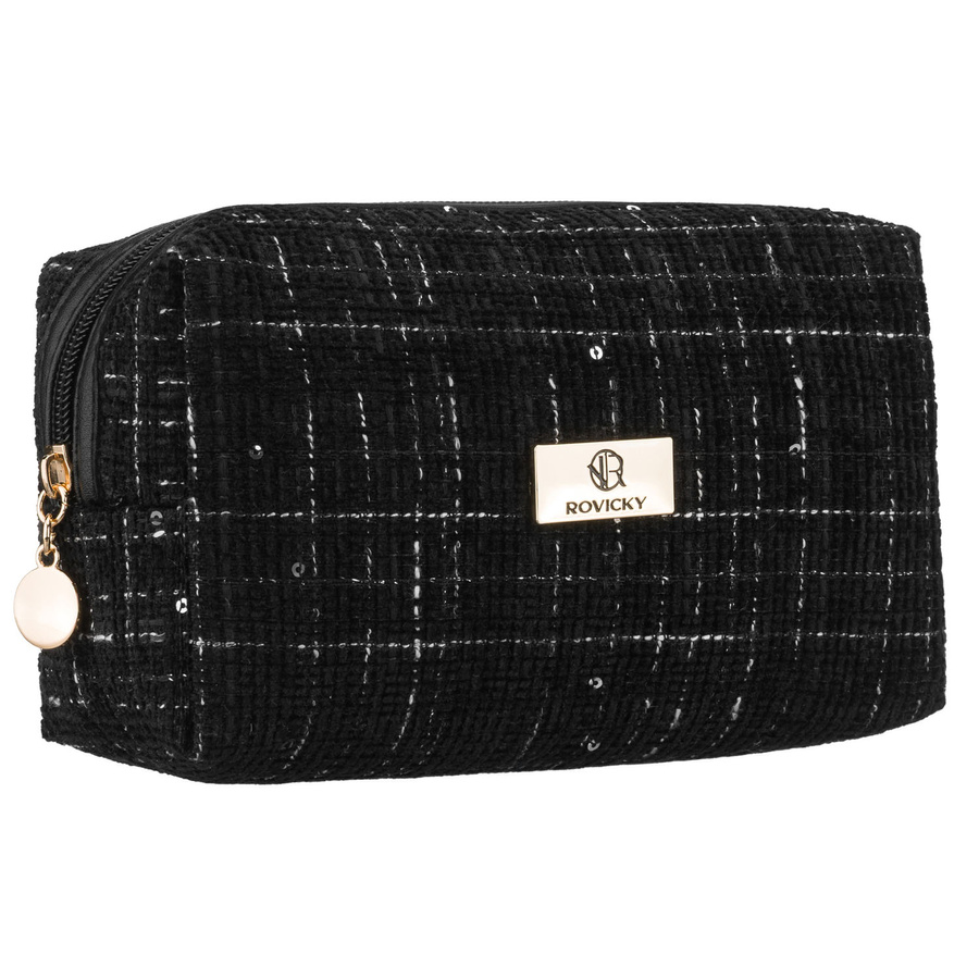 Czarna, pojemna kosmetyczka damska wykonana z materiału syntetycznego, zamykana suwakiem - Rovicky