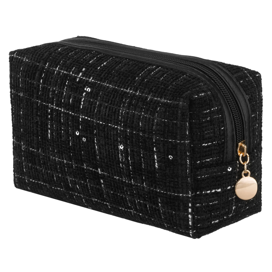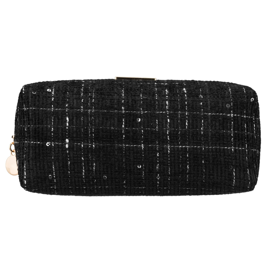 • Kosmetyczka damska z tkaniny syntetycznej pokryta wzorem w kratę. Jednokomorowa w czarnym kolorze. Zamykana bezpiecznym suwakiem. Na froncie ozdobna tabliczka z logo marki.