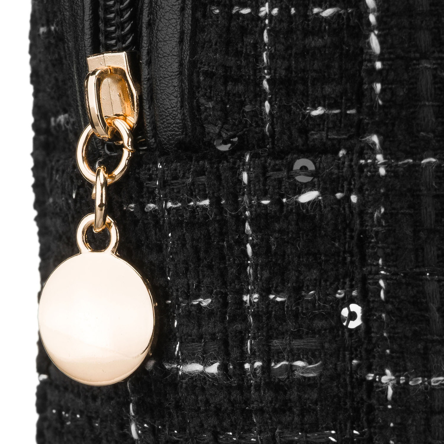 • Wzór kratki z dodatkiem drobnych, połyskujących cekinów, które przyciągają wzrok.