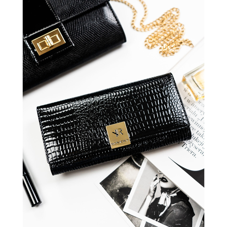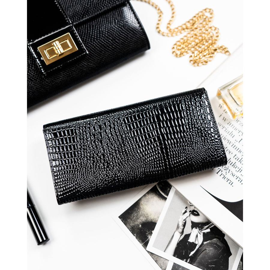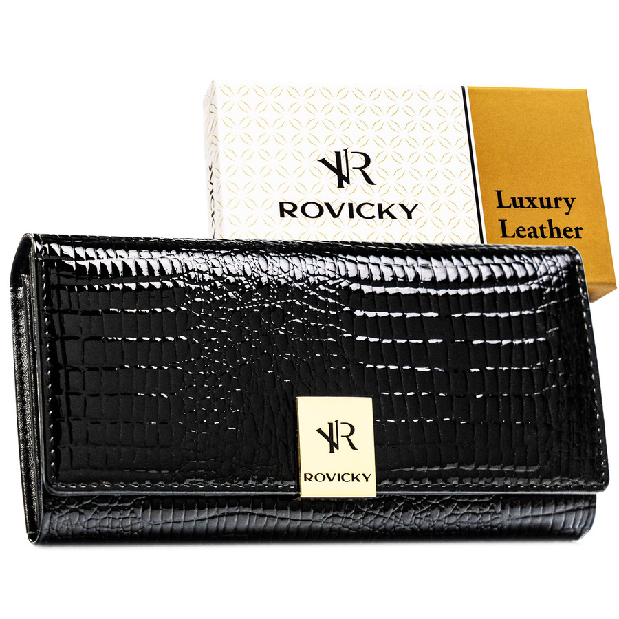 Duży, czarny portfel damski ze skóry naturalnej we wzór imitujący skórę krokodyla - Rovicky