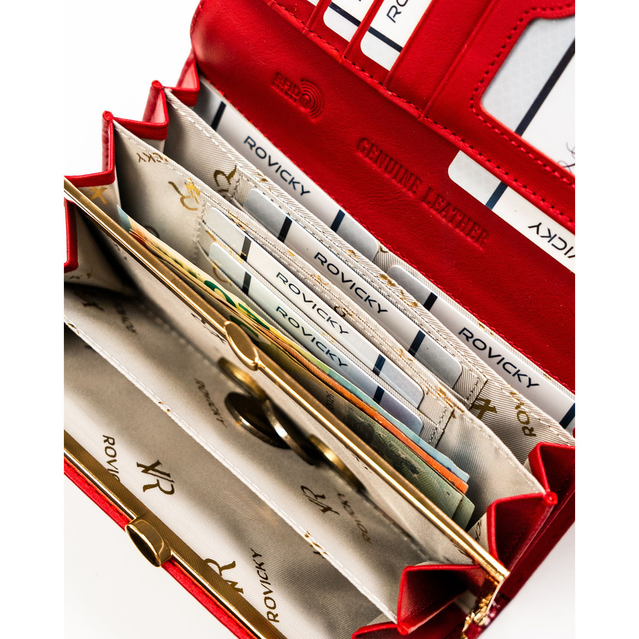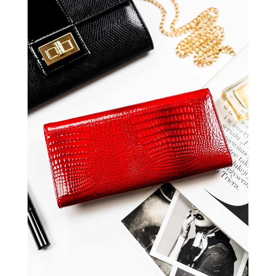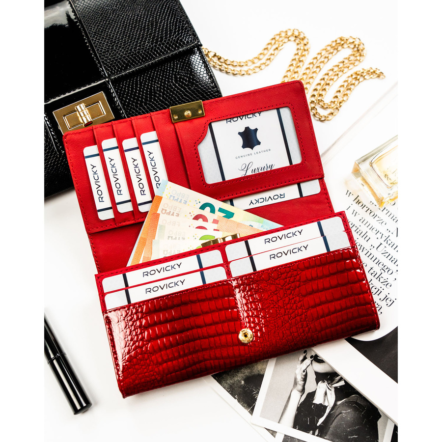 Duży, czerwony portfel damski ze skóry naturalnej we wzór imitujący skórę krokodyla - Rovicky