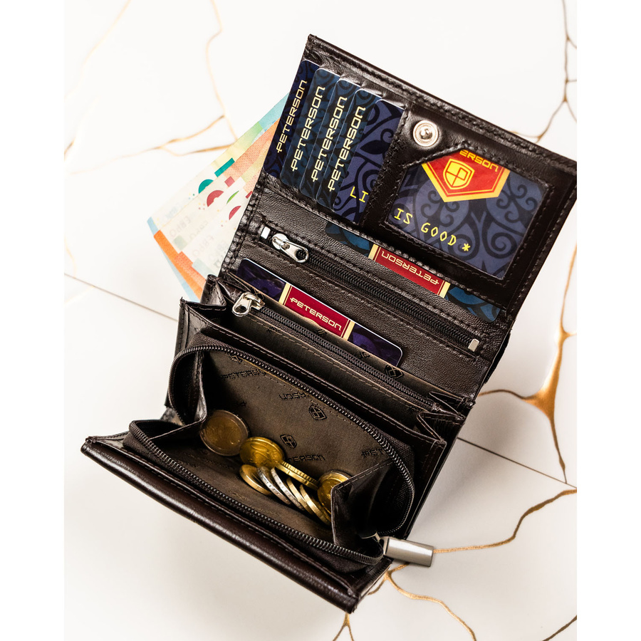 Portfel damski w brązowym kolorze zamykany na zatrzask, wyposażony w system RFID - Peterson