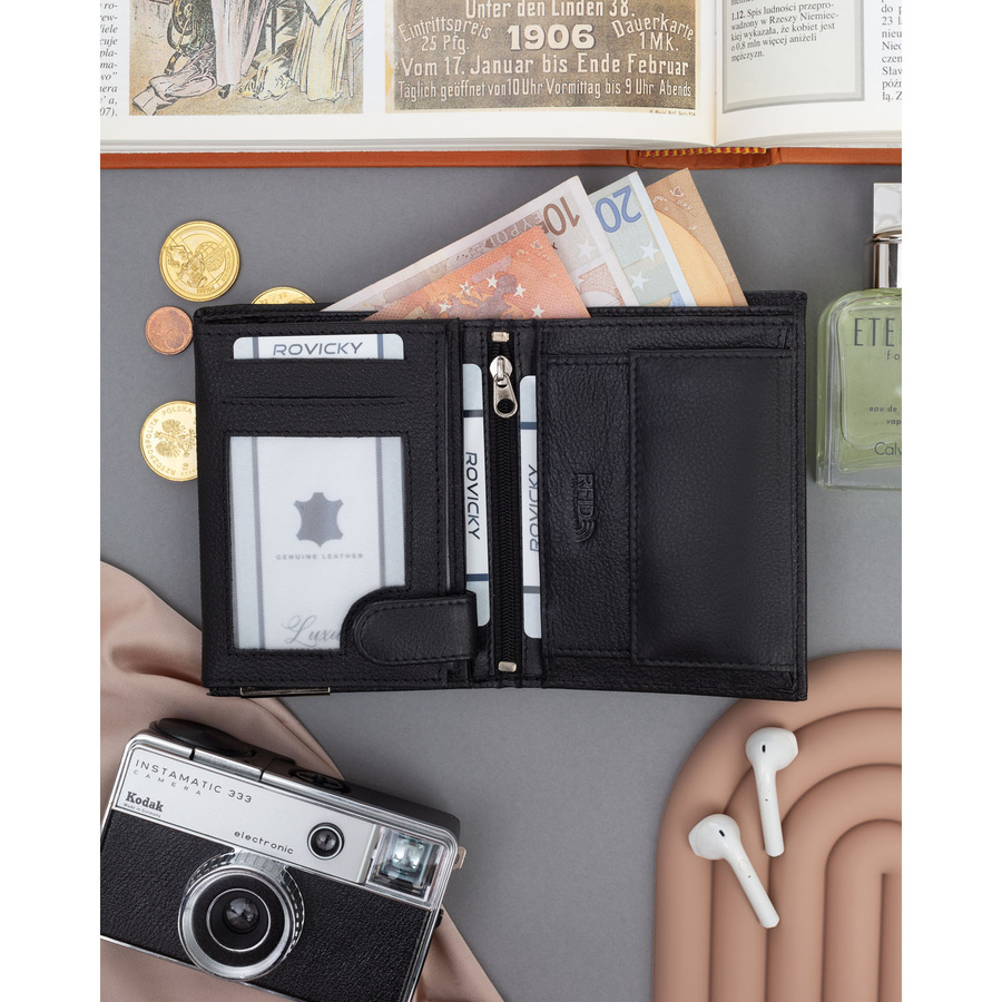 - Dodatkowo znajdziesz 4 przegrody na dokumenty, w tym miejsce na dowód rejestracyjny. Przejrzysty układ sprawia, że wszystko jest łatwo dostępne, bez konieczności rozkładania całego portfela.