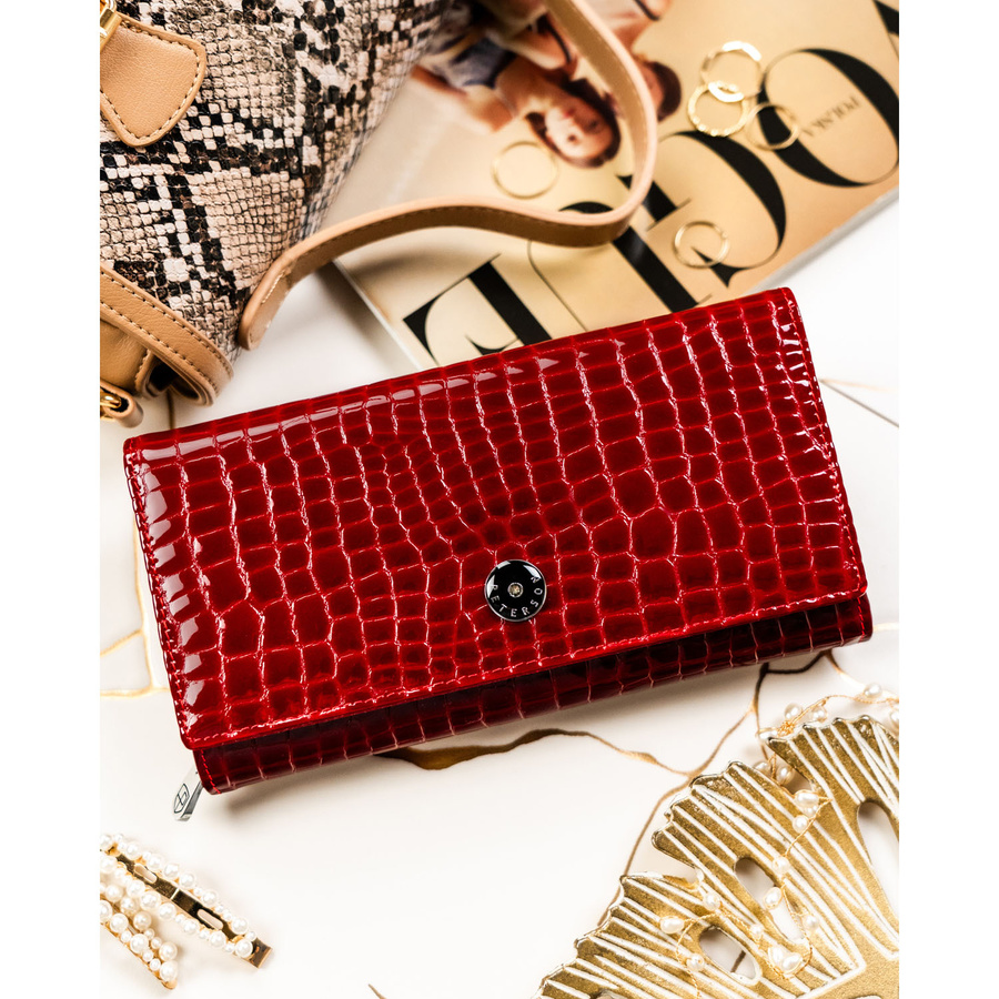 • Stylowy design z lakierowanej skóry naturalnej - Elegancka lakierowana czerwień i tłoczenie krokodyla nadają portfelowi wyjątkowy charakter.