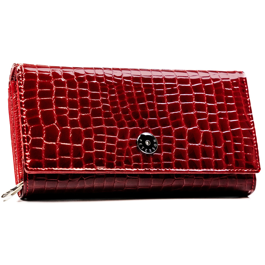 Portfel został zaprojektowany z myślą o kobietach, które cenią sobie zarówno estetykę, jak i praktyczność. Lakierowana skóra nadaje mu elegancki charakter, a tłoczenia inspirowane wzorem krokodyla dodają mu nowoczesnego, luksusowego wyglądu. Starannie dobrane detale, takie jak srebrny logowany suwak i logo PETERSON na froncie, podkreślają jego prestiż.