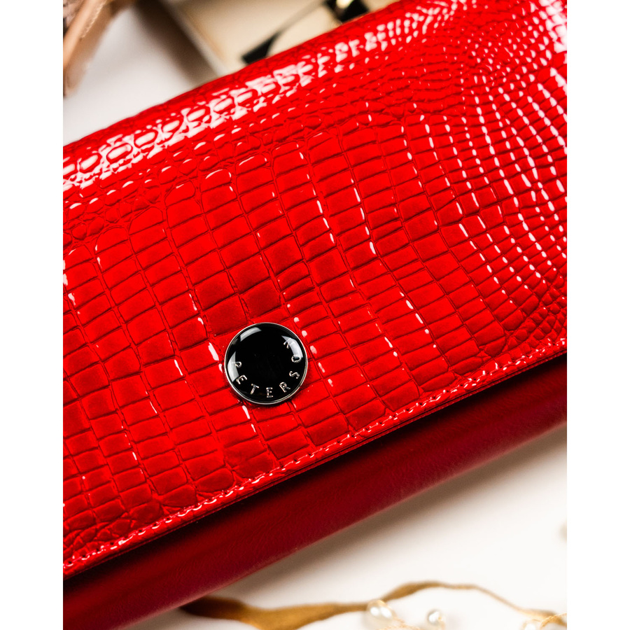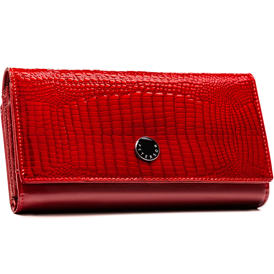 Portfel został zaprojektowany z myślą o kobietach, które cenią sobie zarówno estetykę, jak i praktyczność. Lakierowana skóra nadaje mu elegancki charakter, a tłoczenia inspirowane wzorem krokodyla dodają mu nowoczesnego, luksusowego wyglądu. Starannie dobrane detale, takie jak srebrny logowany suwak i logo PETERSON na froncie, podkreślają jego prestiż.