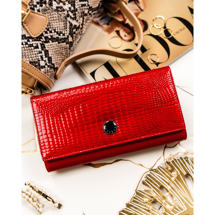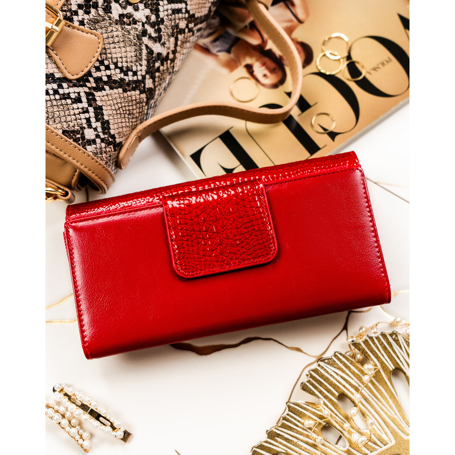 • Stylowy design z lakierowanej skóry naturalnej - Elegancka lakierowana czerwień i tłoczenie krokodyla nadają portfelowi wyjątkowy charakter.
