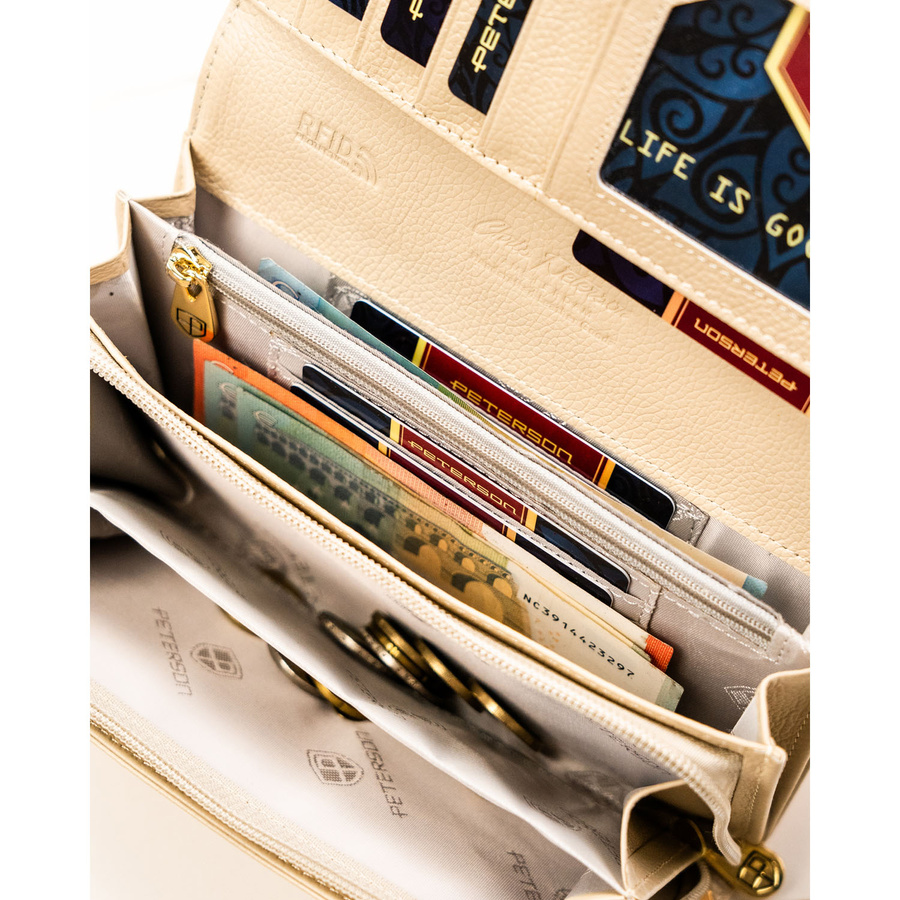 • Bezpieczny portfel RFID | Portfel damski wyposażony w nowoczesną technologię RFID, która skutecznie chroni karty i dokumenty przed nieautoryzowanym odczytem danych.