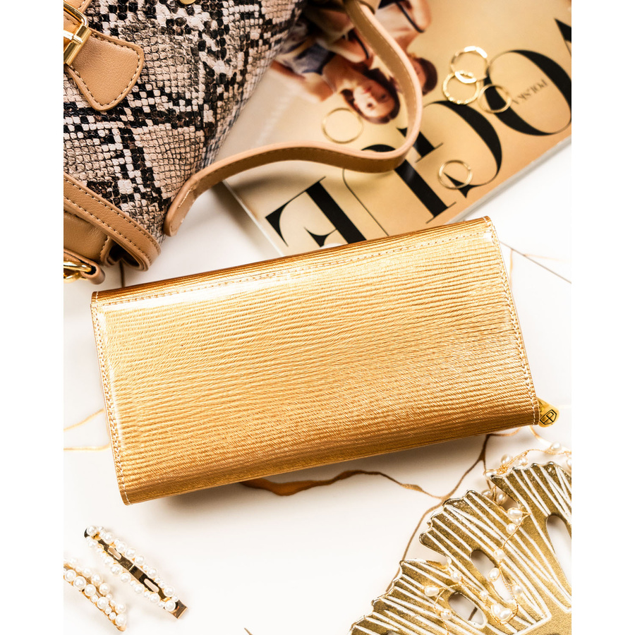 • Duży portfel damski wykonany z naturalnej skóry o lakierowanej fakturze w złotym kolorze. Pod warstwą lakieru widoczny jest stylowy prążkowany wzór. Model oferuje liczne przegródki, kieszenie i komory. Wyposażony w system RFID.