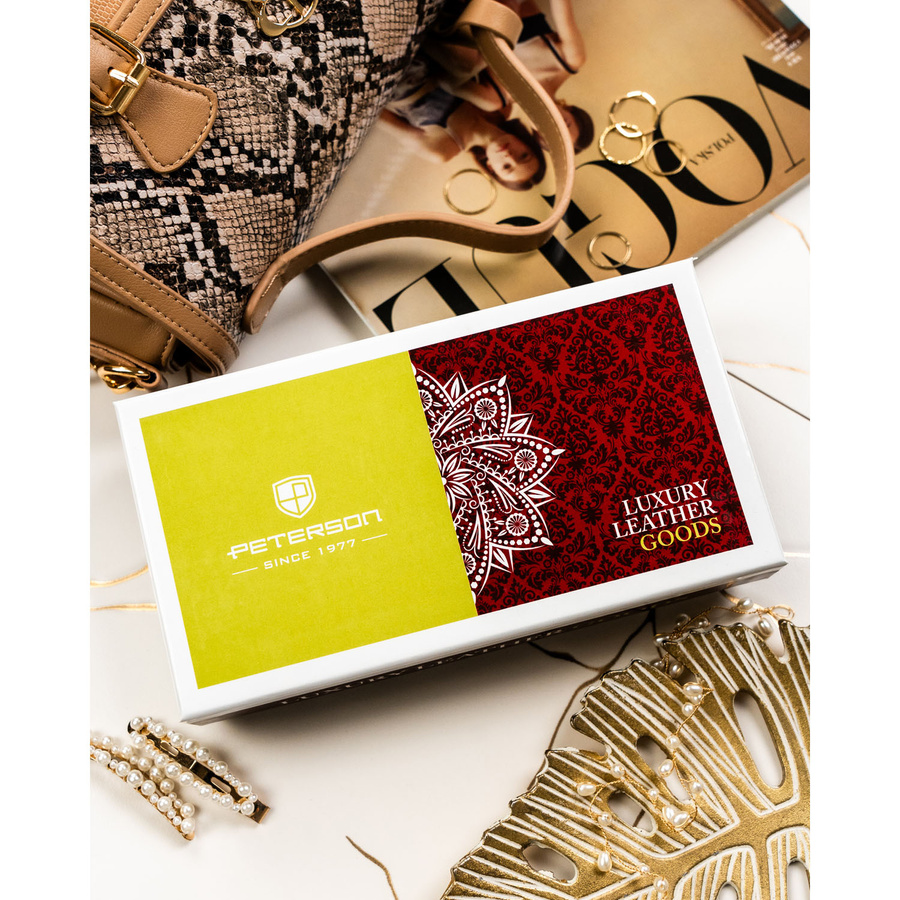 • Pudełko prezentowe | Skórzany portfel damski zapakowany jest w eleganckie firmowe pudełko, idealne jako gotowy prezent dla kobiety.