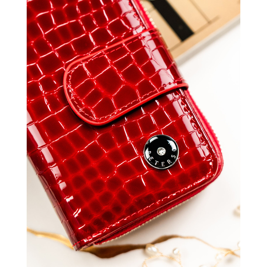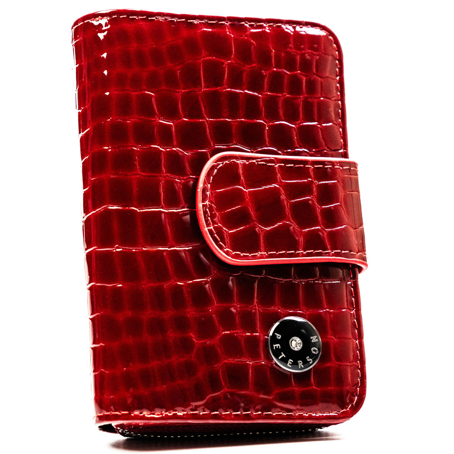 Pionowy, czerwony portfel damski ze skóry naturalnej zamykany na suwak i zatrzask - Peterson
