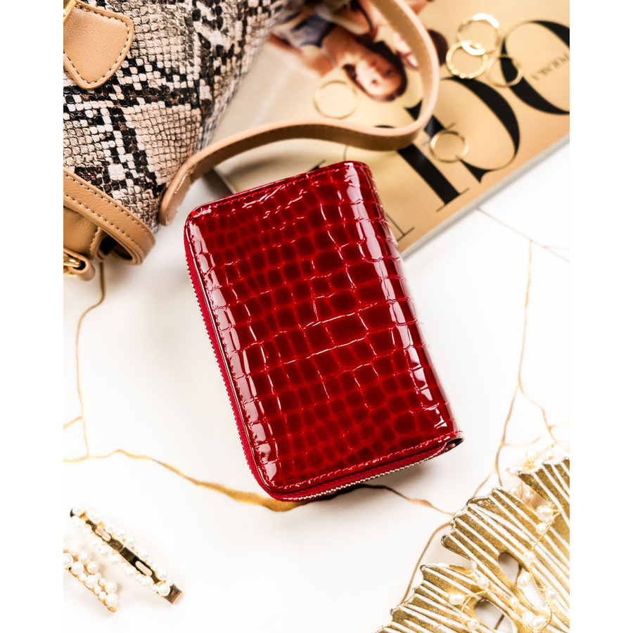• Czerwony, pionowy portfel damski wykonany z naturalnej skóry o lakierowanej fakturze z tłoczeniem na wzór skóry krokodyla. Model w orientacji pionowej, zamykany na suwak i zatrzask. Wyposażony w system RFID.